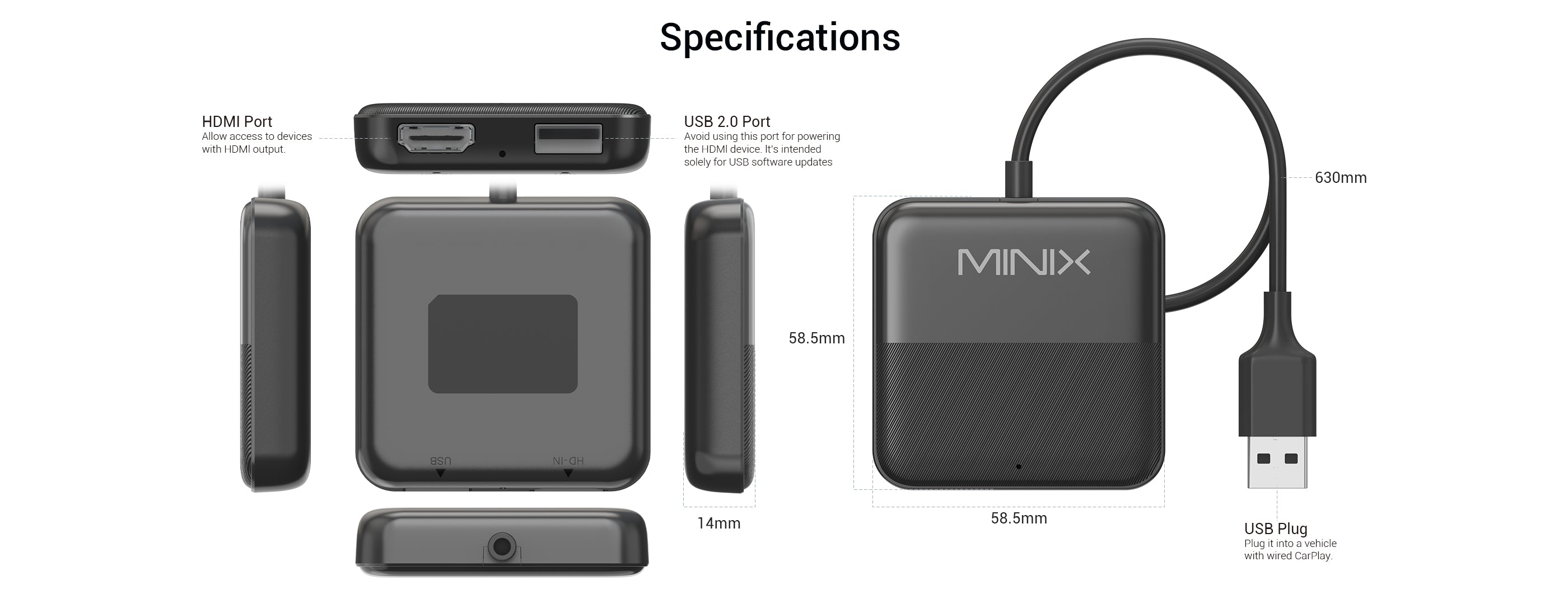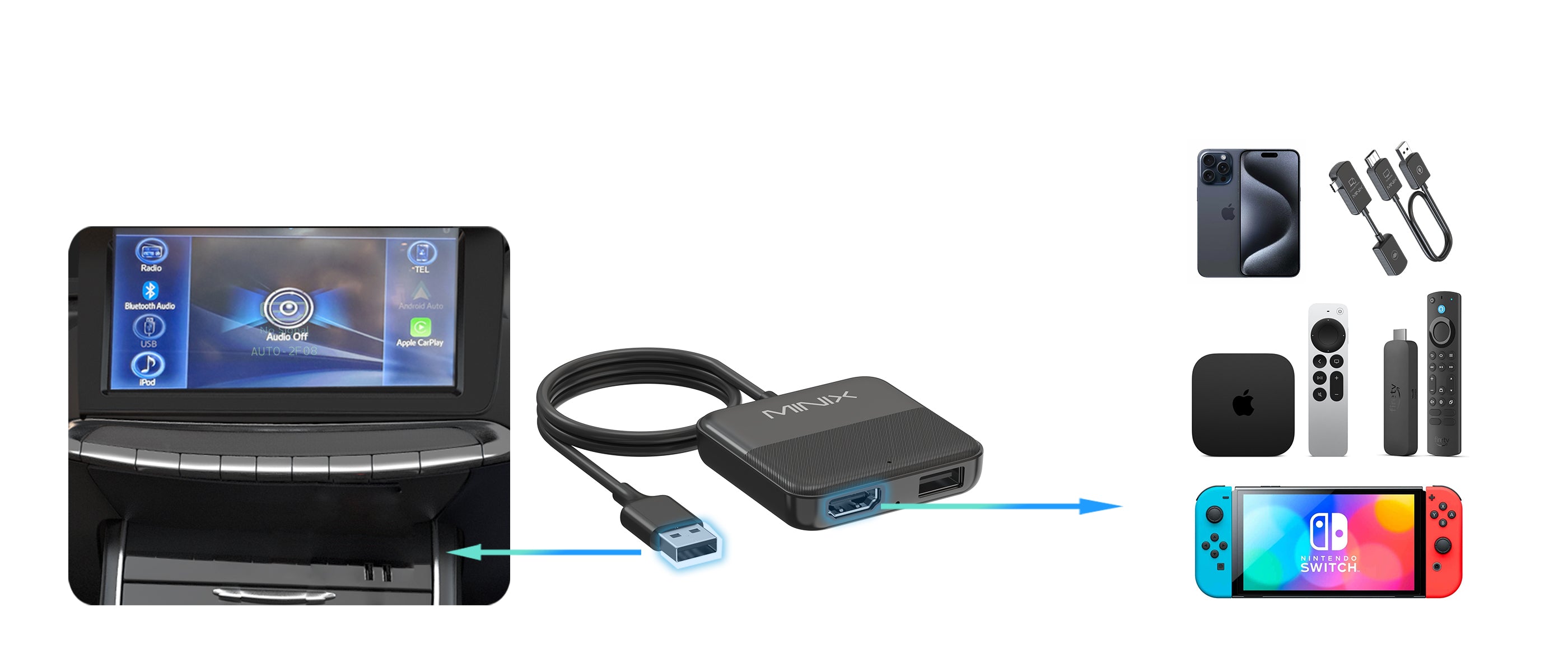 Minix CA361, a versatile CarPlay HDMI display adapter. It seamlessly transfers all HDMI inputs to your in-car CarPlay display unit, allowing users to enjoy gaming with a Nintendo Switch, watch movies from an Amazon TV Stick, DVD player, or any HDMI-supported device. The CA361 enhances in-car entertainment by providing a smooth and integrated experience, making it the ultimate accessory for your vehicle's infotainment system.