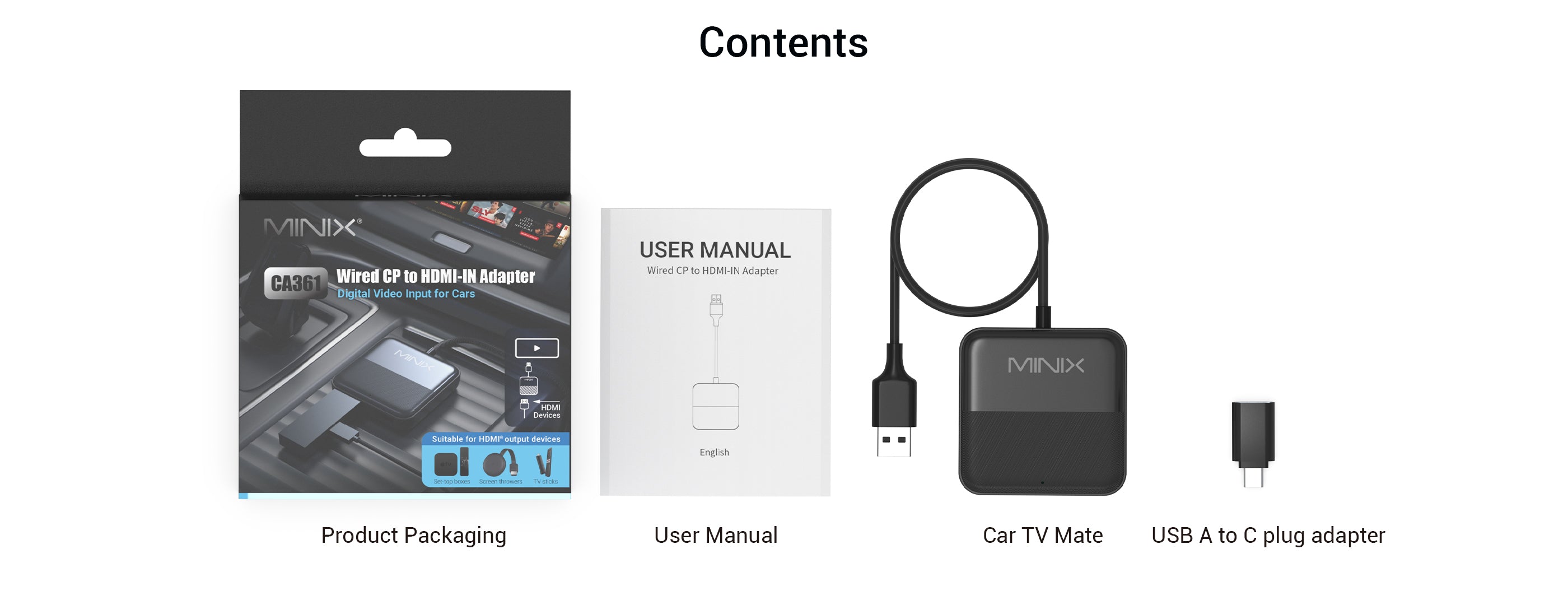 Connect the Minix C1 USB-C to HDMI wireless dongle to the CA361, enabling wireless streaming from your iPhone 15 to your in-car display. Enjoy seamless, cable-free entertainment on the go.