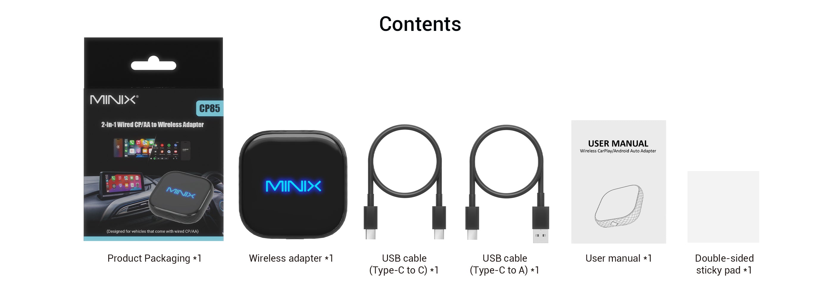 The Minix CP85 is designed to support both CarPlay and Android Auto systems with USB-A or USB-C ports. It comes equipped with two different cables, ensuring seamless integration and compatibility with a wide range of devices.