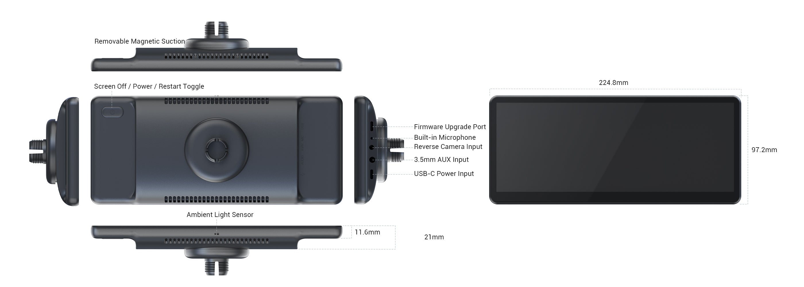 The CP89-HD CarPlay monitor boasts a sleek design with a thin bezel, enhancing your vehicle's interior aesthetics. The CP89-HD is equipped with a magnetic mount and a suction cup mount, ensuring a secure fit on most car dashboards while allowing for easy removal. Its mounting options fit various in-car layouts, ensuring a perfect integration into your vehicle's interior.