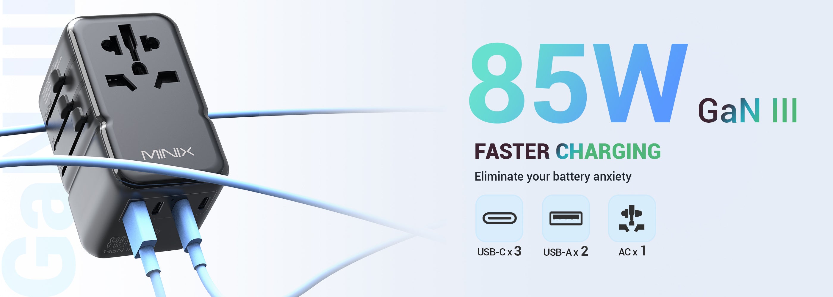 The MINIX TP85 universal travel adapter features cutting-edge GaN III technology, delivering a powerful 85W output for high-speed charging. Equipped with PD 3.0 and Qualcomm Quick Charge 4+, the TP85 delivers ultra-fast charging, optimizes power efficiency, and ensures device safety with advanced thermal management. Whether you're powering up your phone, tablet, or laptop, the TP85 gets you back to full power in no time.