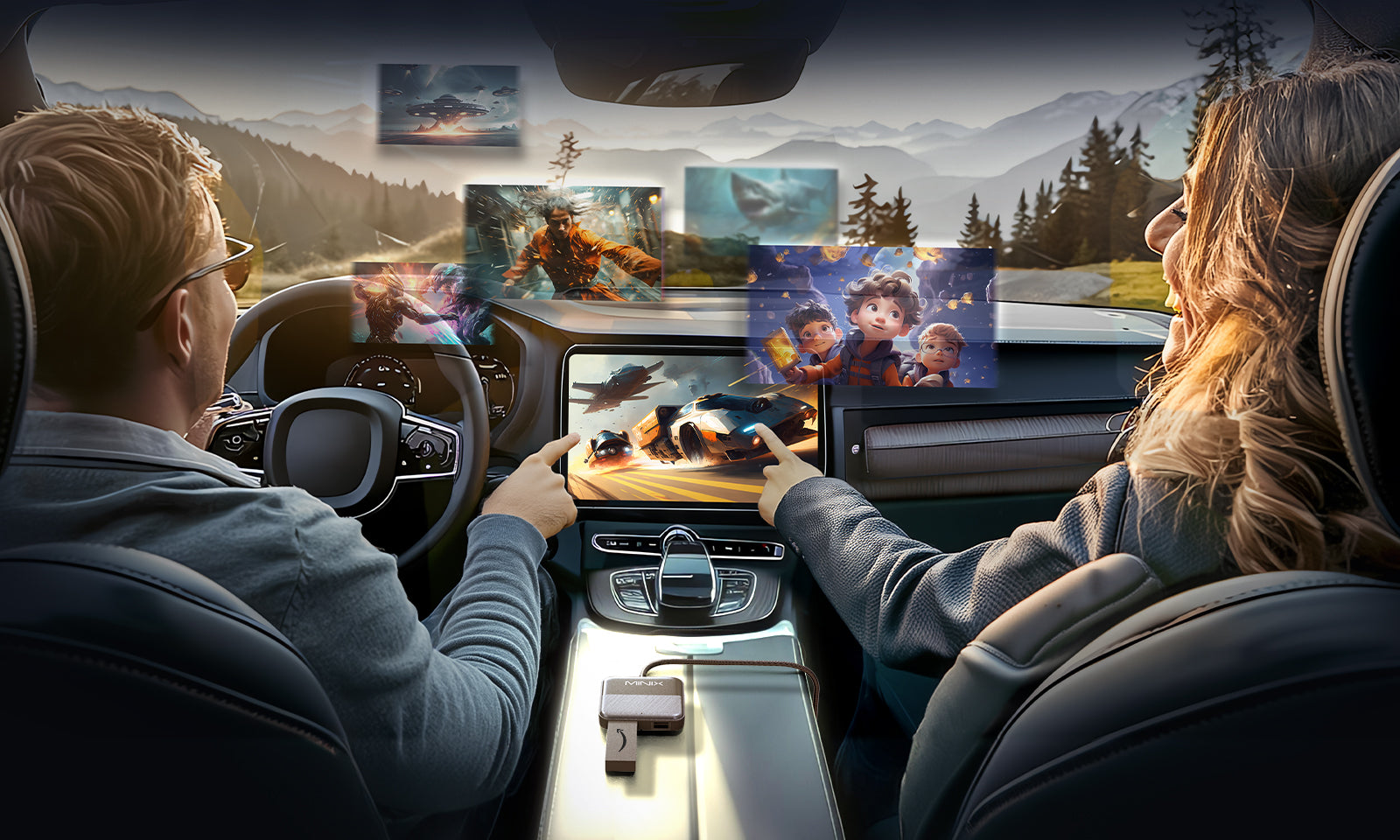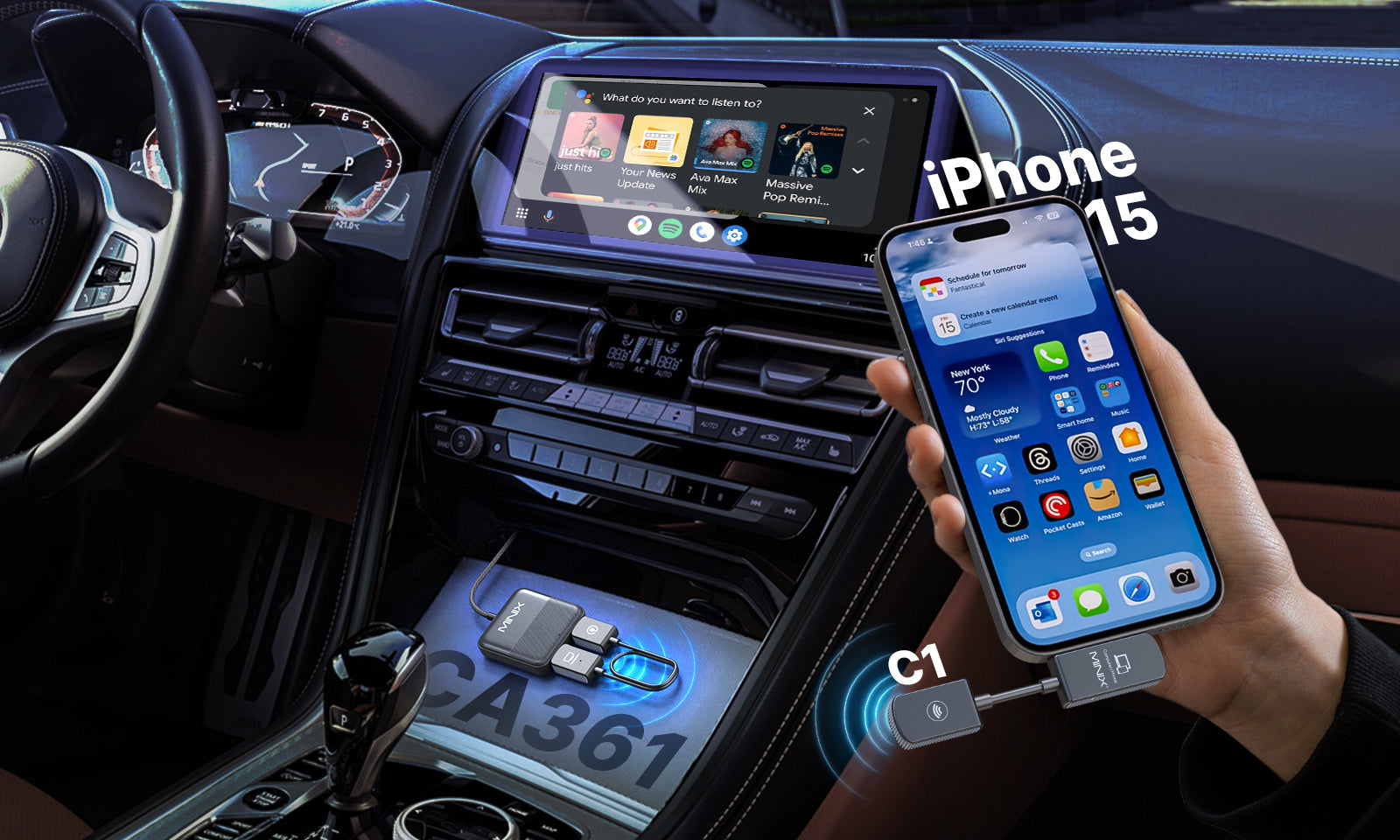 Verbinden Sie den Minix C1 USB-C-auf-HDMI-Wireless-Dongle mit dem CA361 und streamen Sie kabellos von Ihrem iPhone 15 auf Ihr Autodisplay. Genießen Sie nahtlose, kabellose Unterhaltung unterwegs.