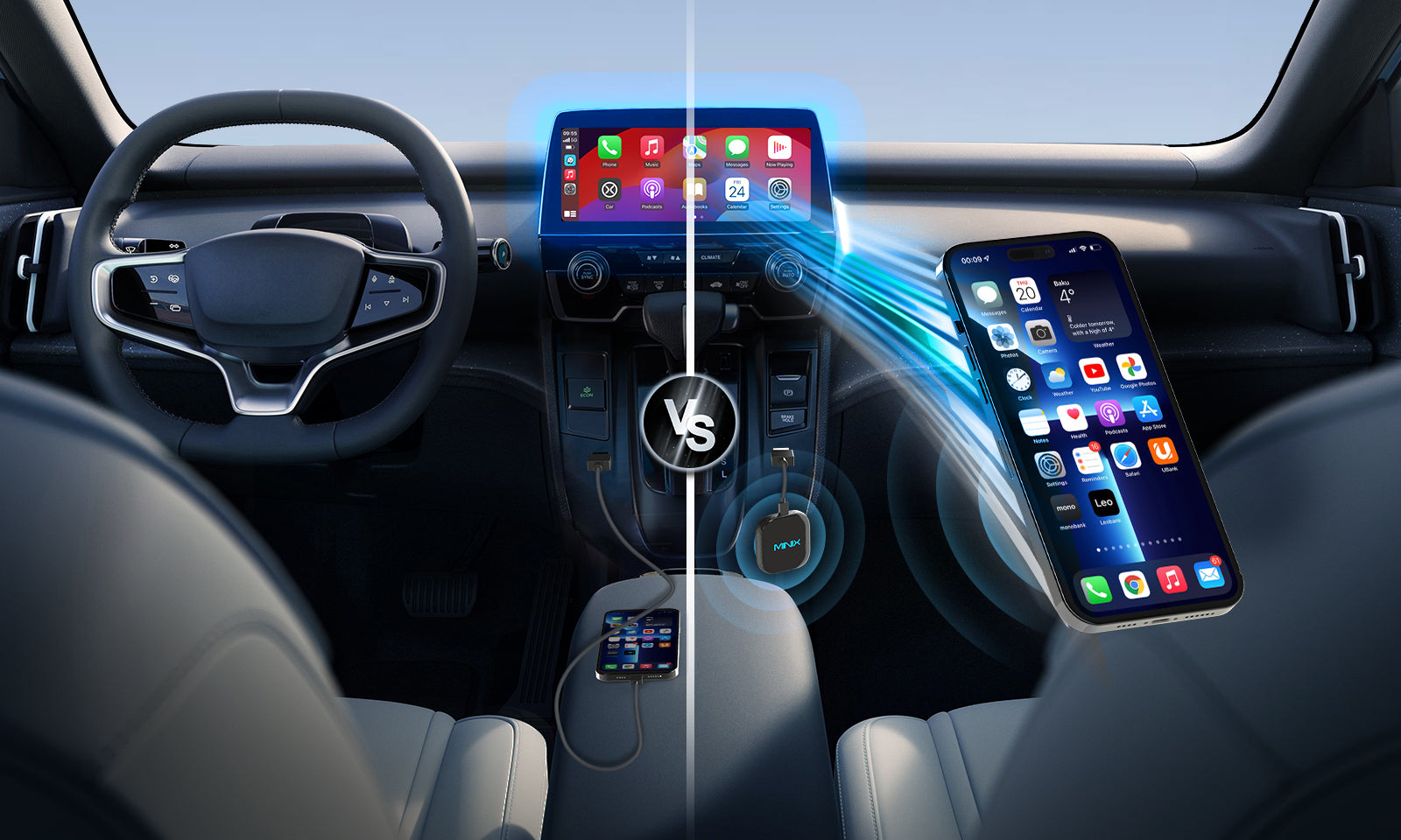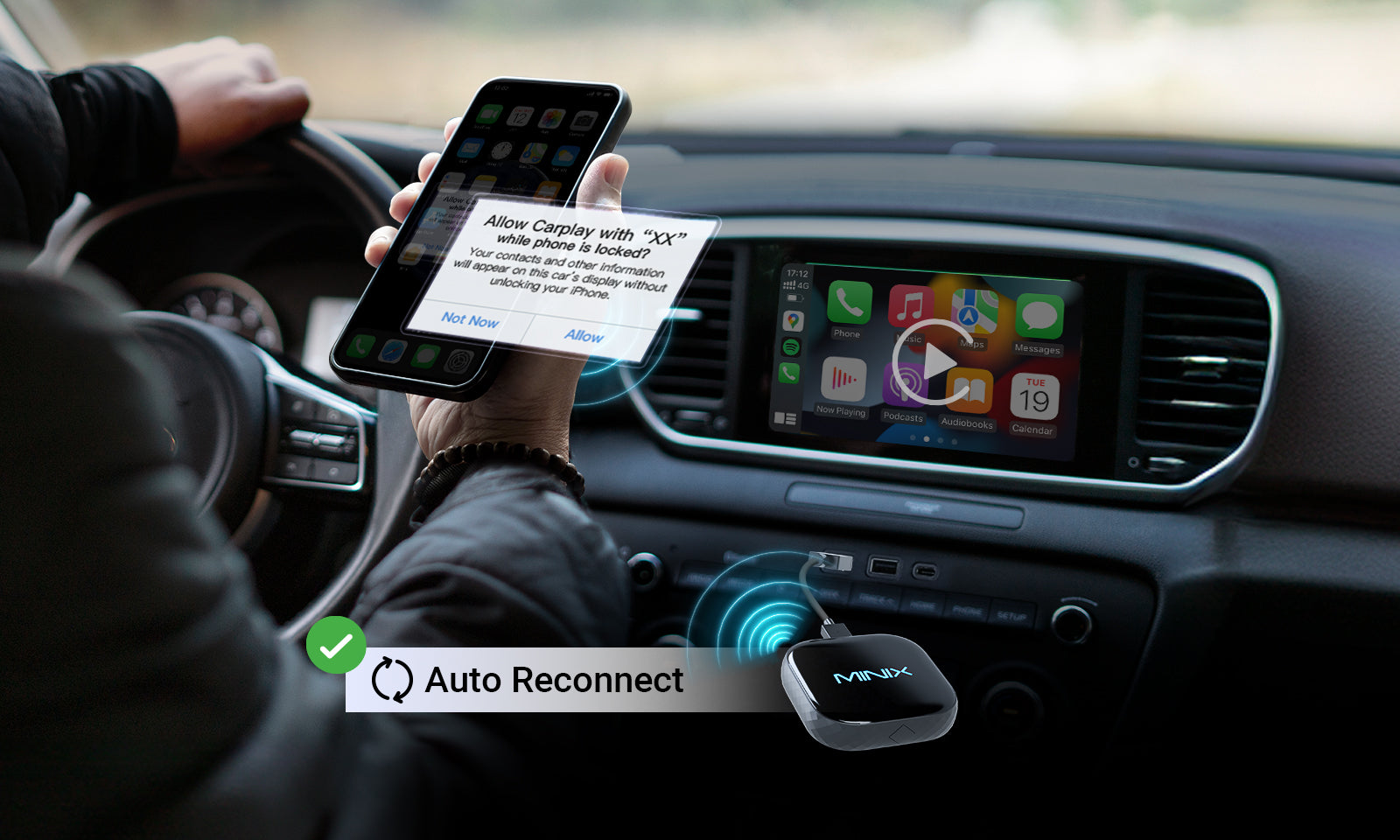 Das Minix CP85 verbindet sich automatisch mit Ihrem CarPlay-System, sobald Sie in Ihr Fahrzeug einsteigen. Genießen Sie nahtlose Kontinuität ohne manuelle Einrichtung. Diese Funktion sorgt für ein stressfreies und komfortables Fahrerlebnis, sodass Sie sich auf die Straße konzentrieren können.
