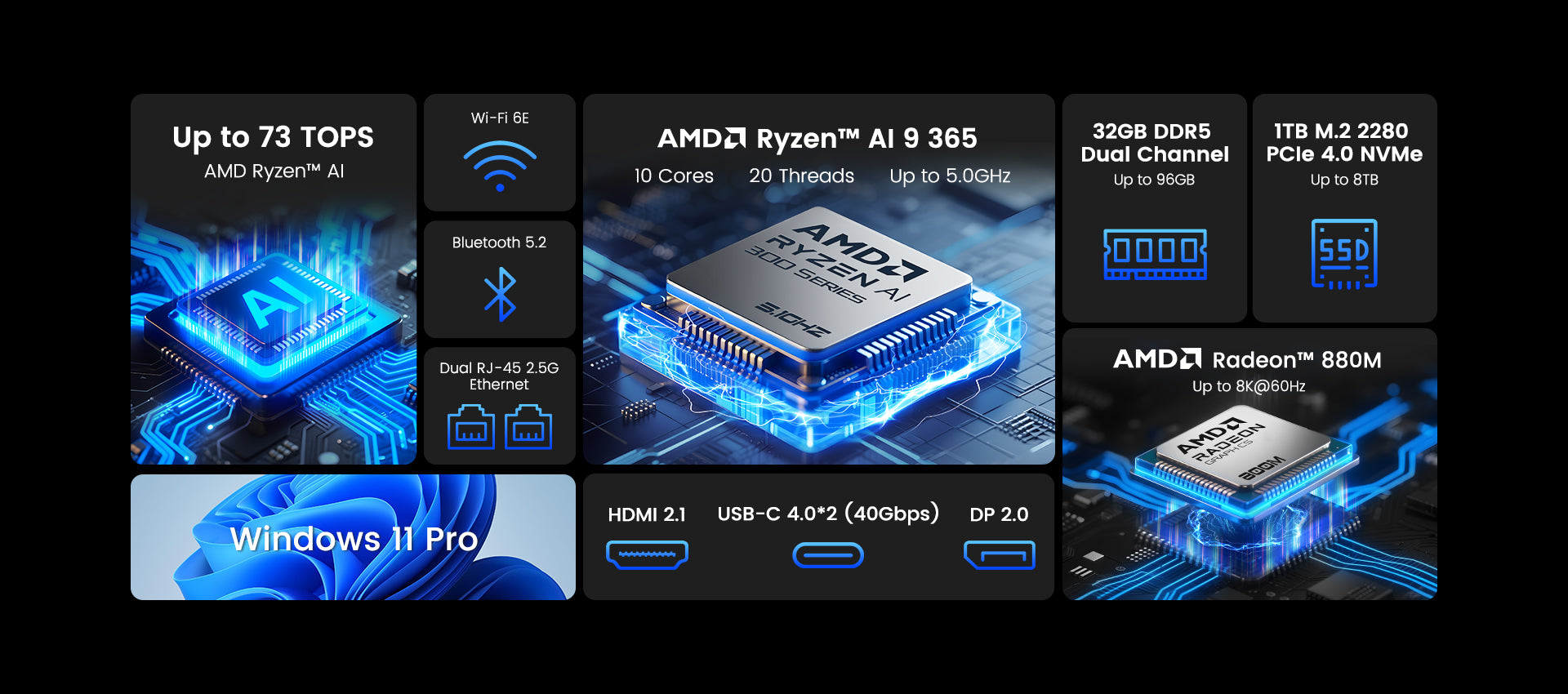Built-in AMD Ryzen™ AI NPU delivers up to 73 TOPS AI compute power, enabling independent local AI task handling—no network/cloud needed, ensuring fast, efficient processing.