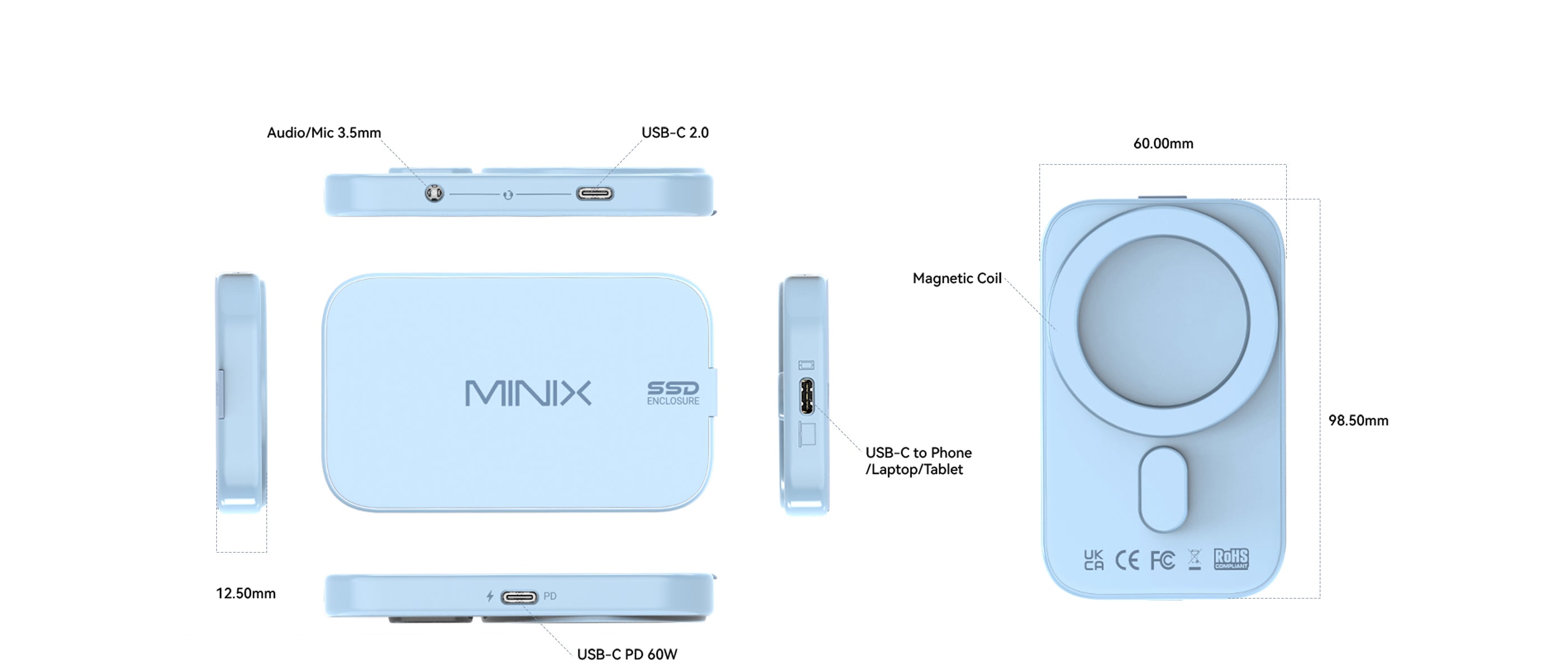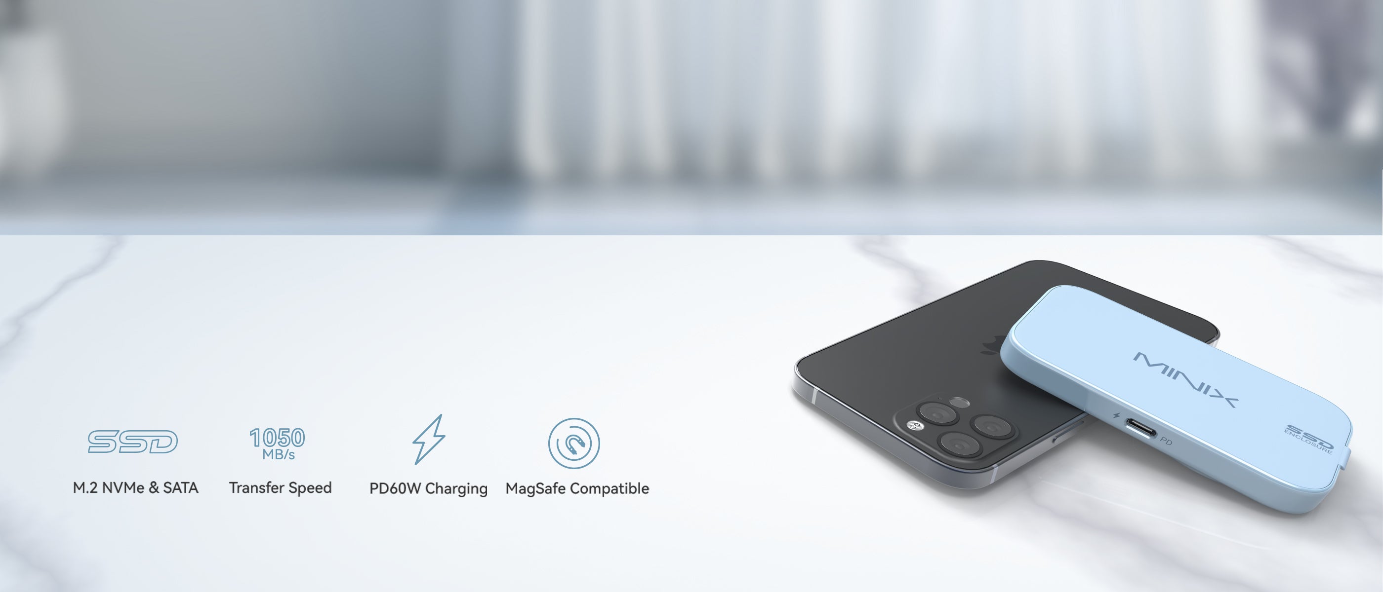 Der MINIX MSE01 SSD-Gehäuseadapter ist kompatibel mit MagSafe für iPhone 15/16 Serie und Laptops und unterstützt M.2 NVMe & SATA SSD (2280/2260/2242/2230 mm). Ob Sie Arbeitsdokumente oder Unterhaltungsmedien speichern, es bietet flexible Speicherlösungen.