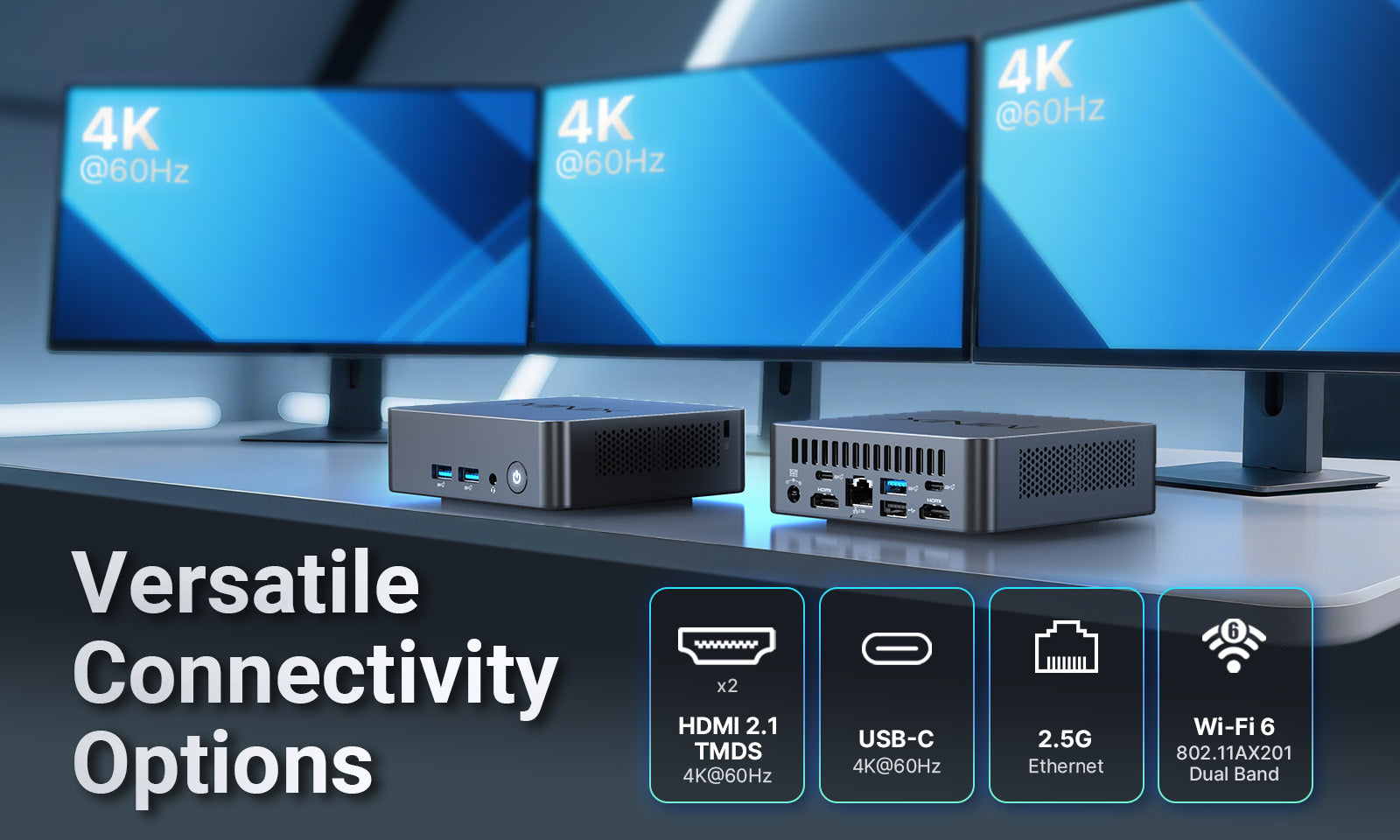 Der NUC150 verfügt über eine umfassende Palette an Konnektivitätsoptionen, darunter zwei HDMI 2.1 TMDS-Anschlüsse mit Unterstützung für 4K@60Hz, mehrere USB-Anschlüsse (einschließlich USB-C mit DisplayPort 1.4 und Stromversorgungsfunktionen), einen 2,5G-Ethernet-Anschluss und einen M.2 2230 Intel® 802.11AX201 Dual Band Wi-Fi 6-Karte mit BT5.2. Diese Funktionen decken eine breite Palette von Peripherie- und Netzwerkanforderungen ab.