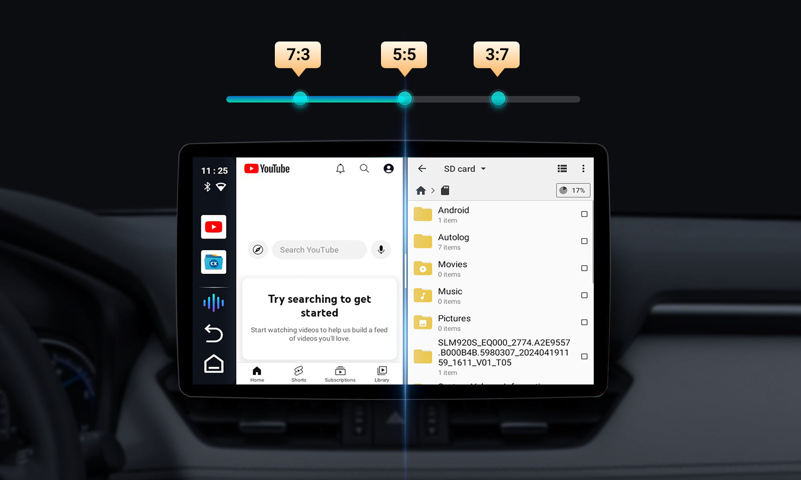 L'unité CarPlay Minix CA480 offre une interface simple, permettant de passer d'un écran partagé à un format 5 : 5, 3 : 7 ou 7 : 3 en une seule touche, ce qui rend le multitâche sans effort et améliore la polyvalence de l'affichage.