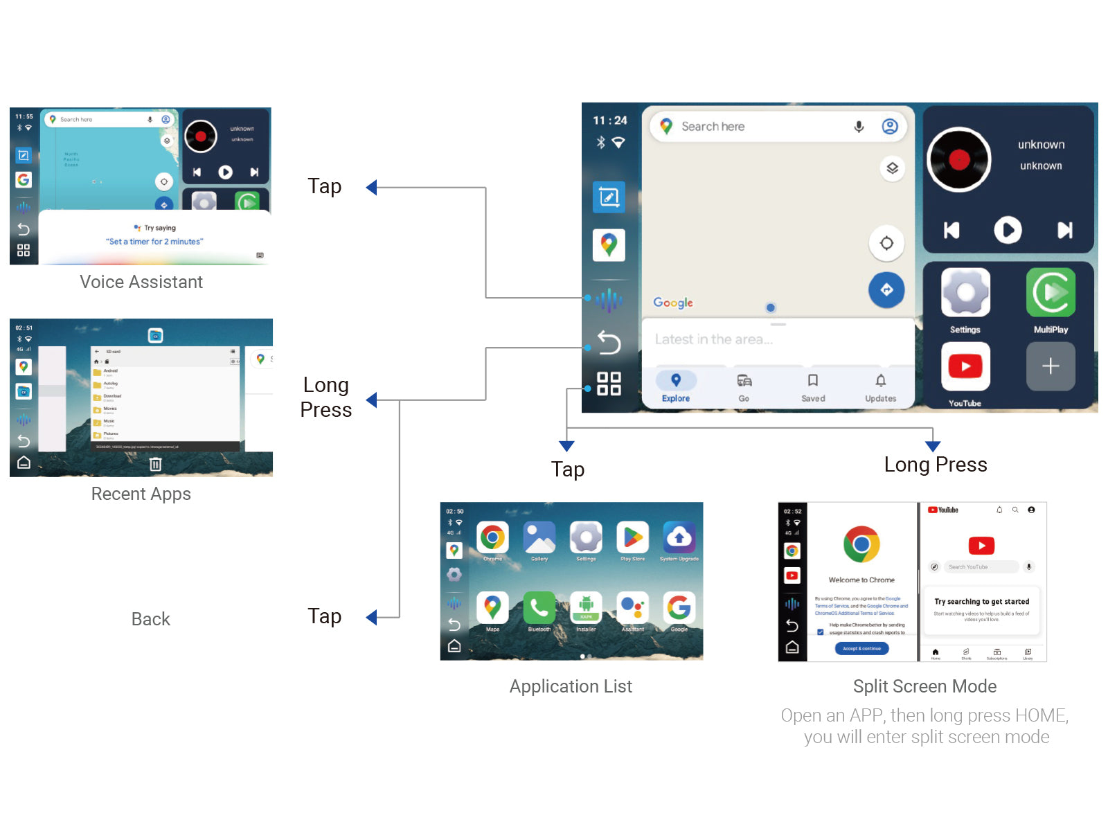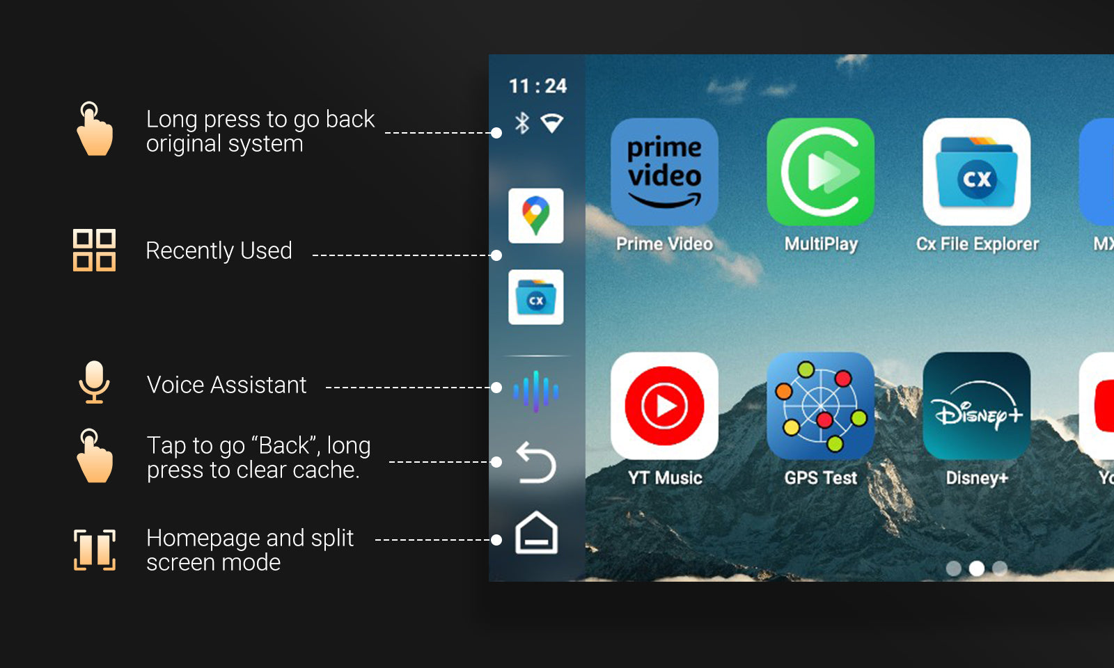 Le CA480 prend en charge trois systèmes : Apple CarPlay, Android Auto et un système Android personnalisé. Cette compatibilité polyvalente assure une intégration fluide avec divers appareils, améliorant ainsi la connectivité et l'expérience utilisateur.