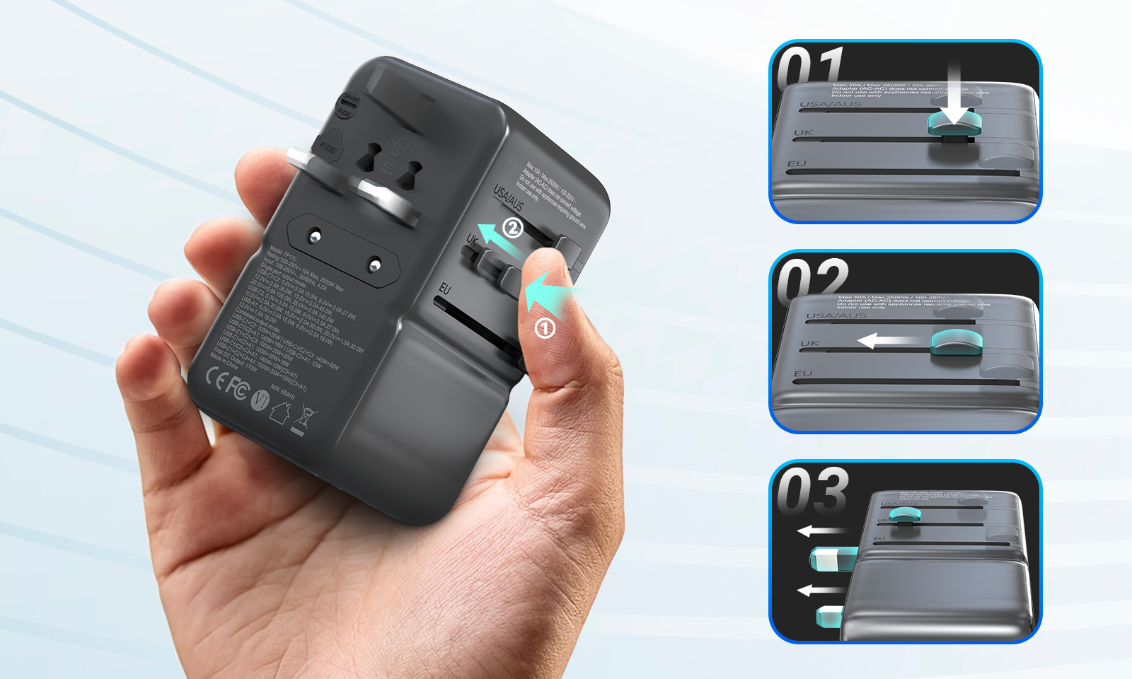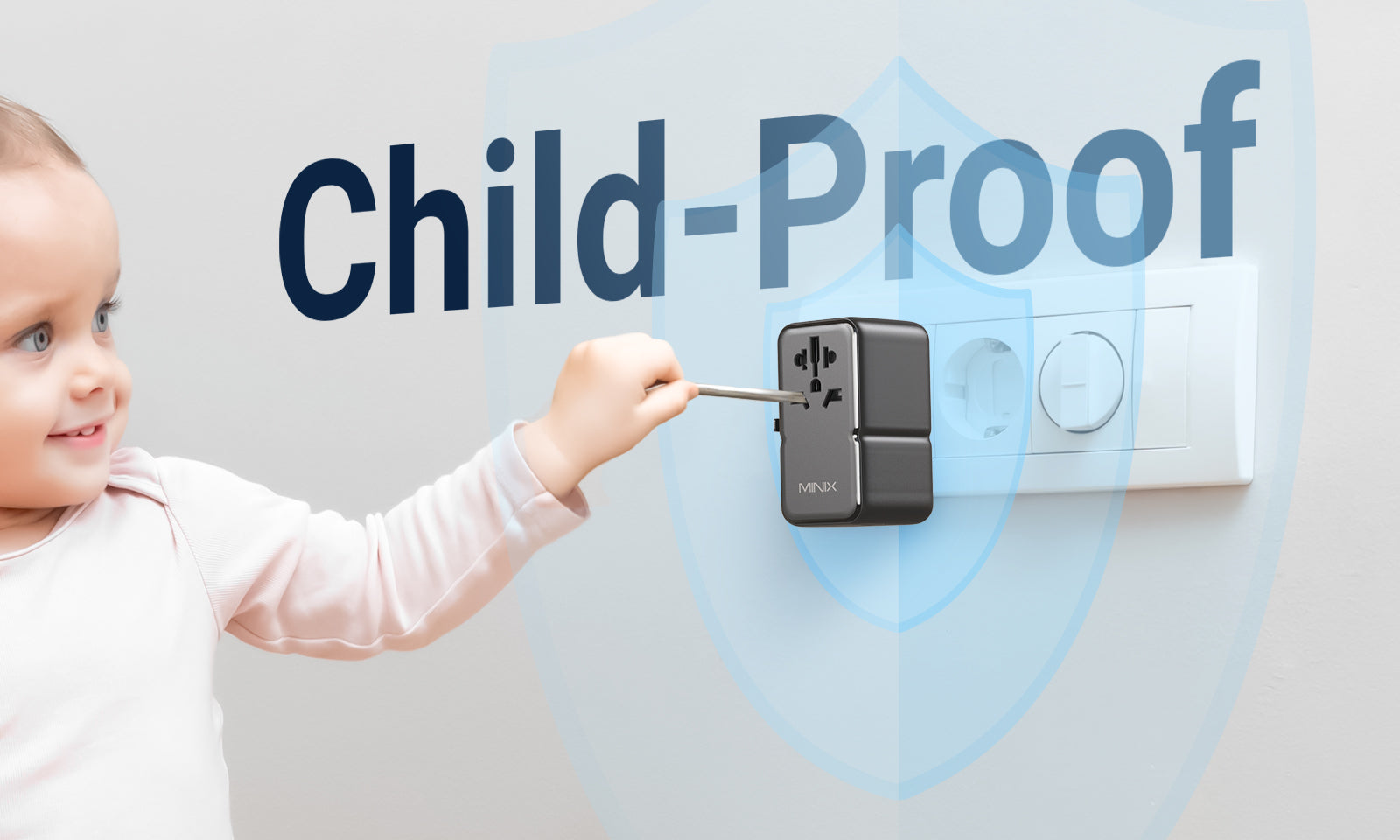 *Nos nouveaux adaptateurs de voyage sont dotés d'un mécanisme de sécurité qui empêche les chocs électriques en garantissant que toutes les broches doivent être complètement et correctement insérées avant d'établir une connexion, éliminant ainsi le risque de contacts partiels et dangereux.