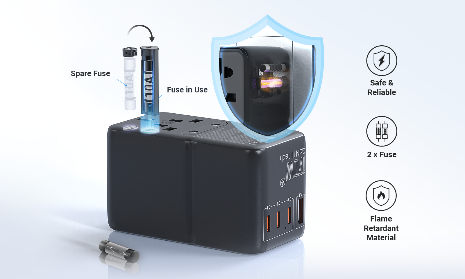 Équipé d'un double système de fusibles de 10 A : un actif et un de secours, l'adaptateur de voyage universel TP170 protège contre les surintensités, les surtensions et les courts-circuits. Il est doté d'un mécanisme de sécurité qui prévient les chocs électriques. Ce dispositif garantit que toutes les broches sont correctement insérées avant la connexion, éliminant ainsi le risque de contacts partiels et dangereux.