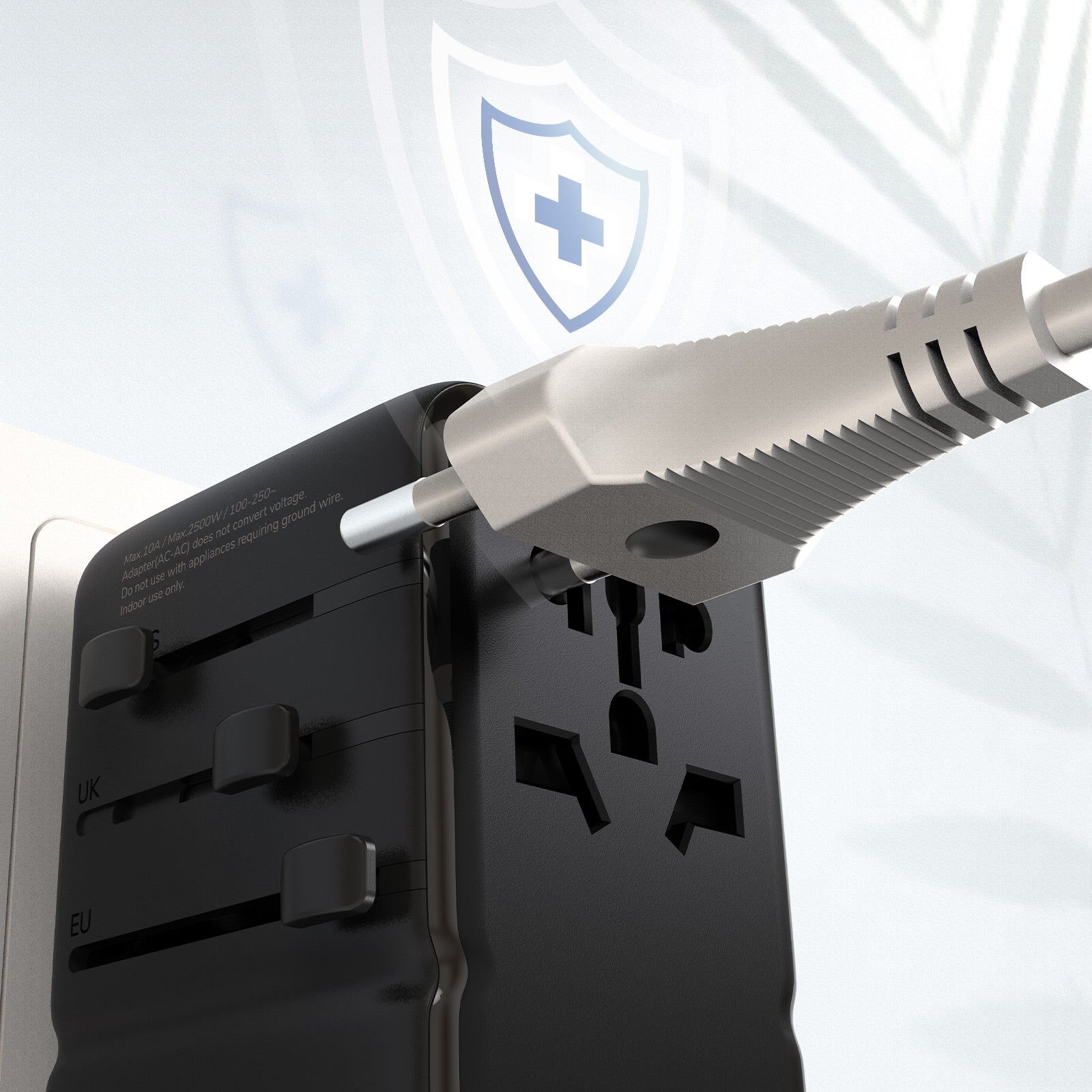 Nos nouveaux adaptateurs de voyage sont dotés d'un mécanisme de sécurité qui empêche les chocs électriques en garantissant que toutes les broches doivent être complètement et correctement insérées avant d'établir une connexion, éliminant ainsi le risque de contacts partiels et dangereux.