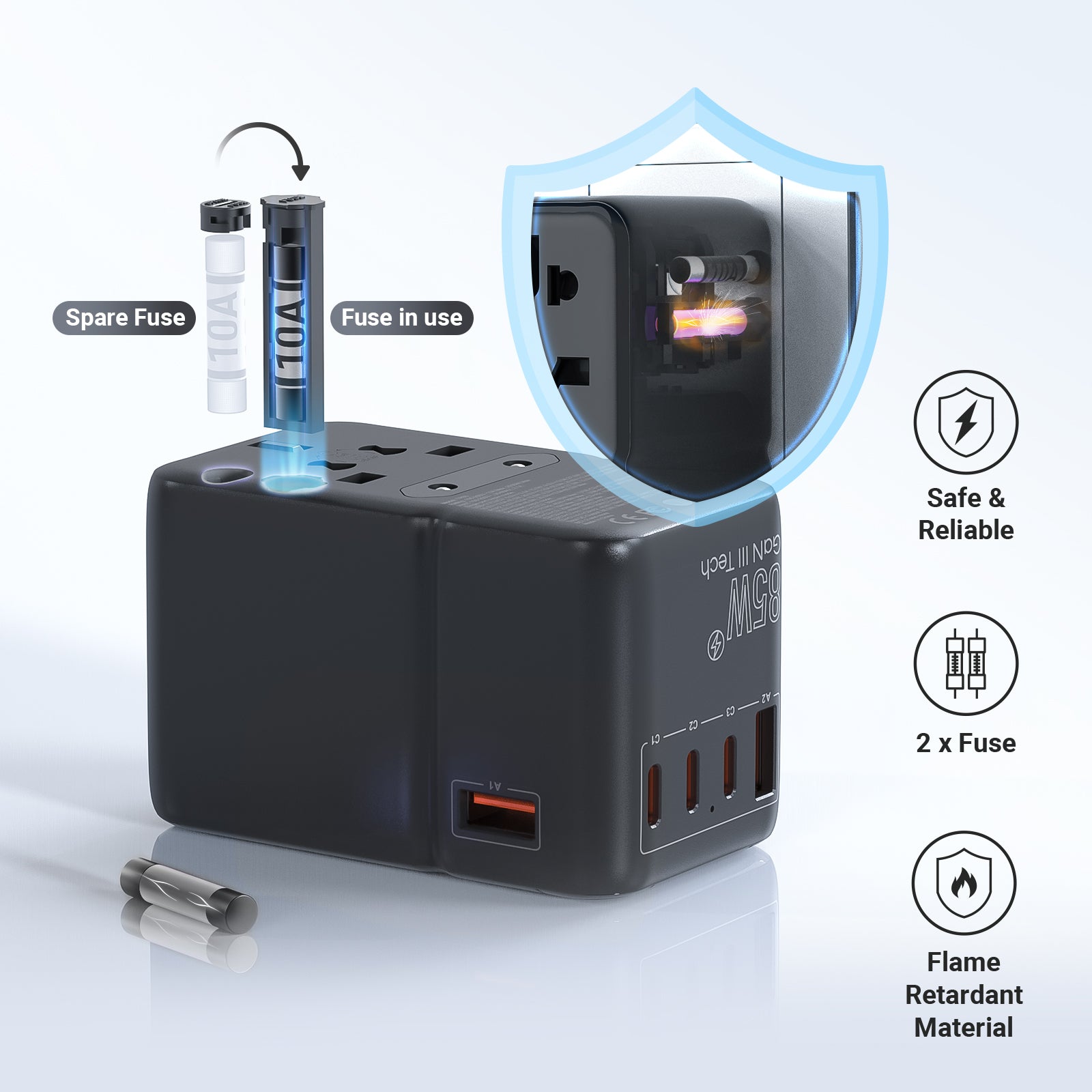 Notre adaptateur de voyage est doté d'un double fusible de 10 A (un actif et un de secours) assurant une protection continue contre les surintensités, les surtensions et les courts-circuits. Certifié RoHS, CE et FCC, il garantit une charge sûre et fiable, et son boîtier ignifuge vous assure une tranquillité d'esprit en voyage.