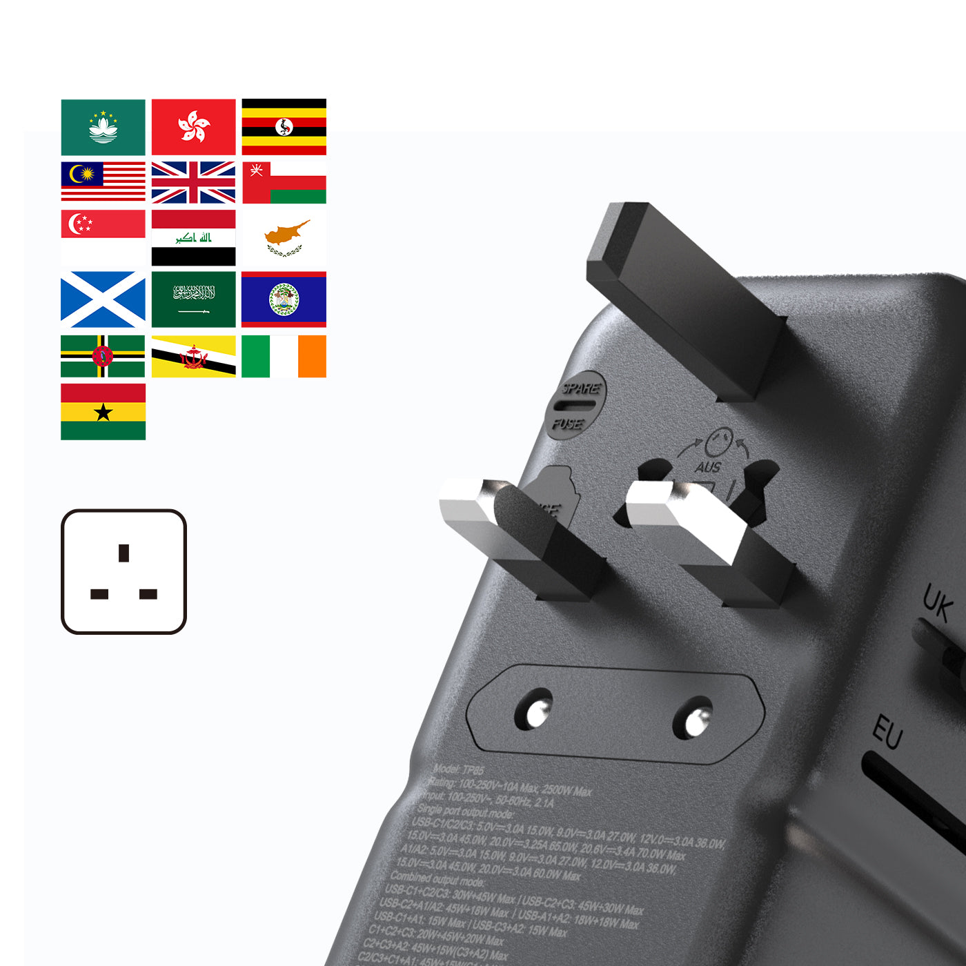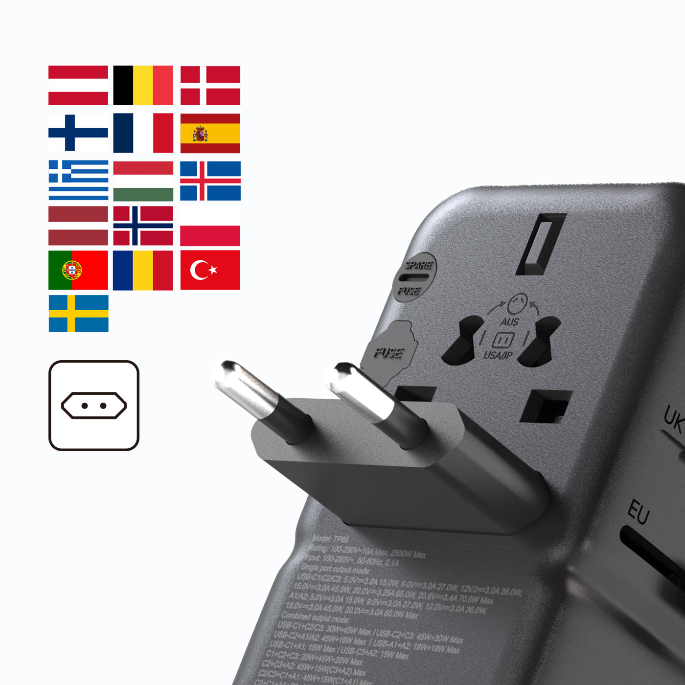 L'adaptateur de voyage universel TP85 offre des solutions de charge USB intégrées, ce qui le rend indispensable pour une expérience de charge polyvalente. Compatible avec les appareils Apple, Android et autres, le TP85 assure une charge optimale pour chaque appareil.