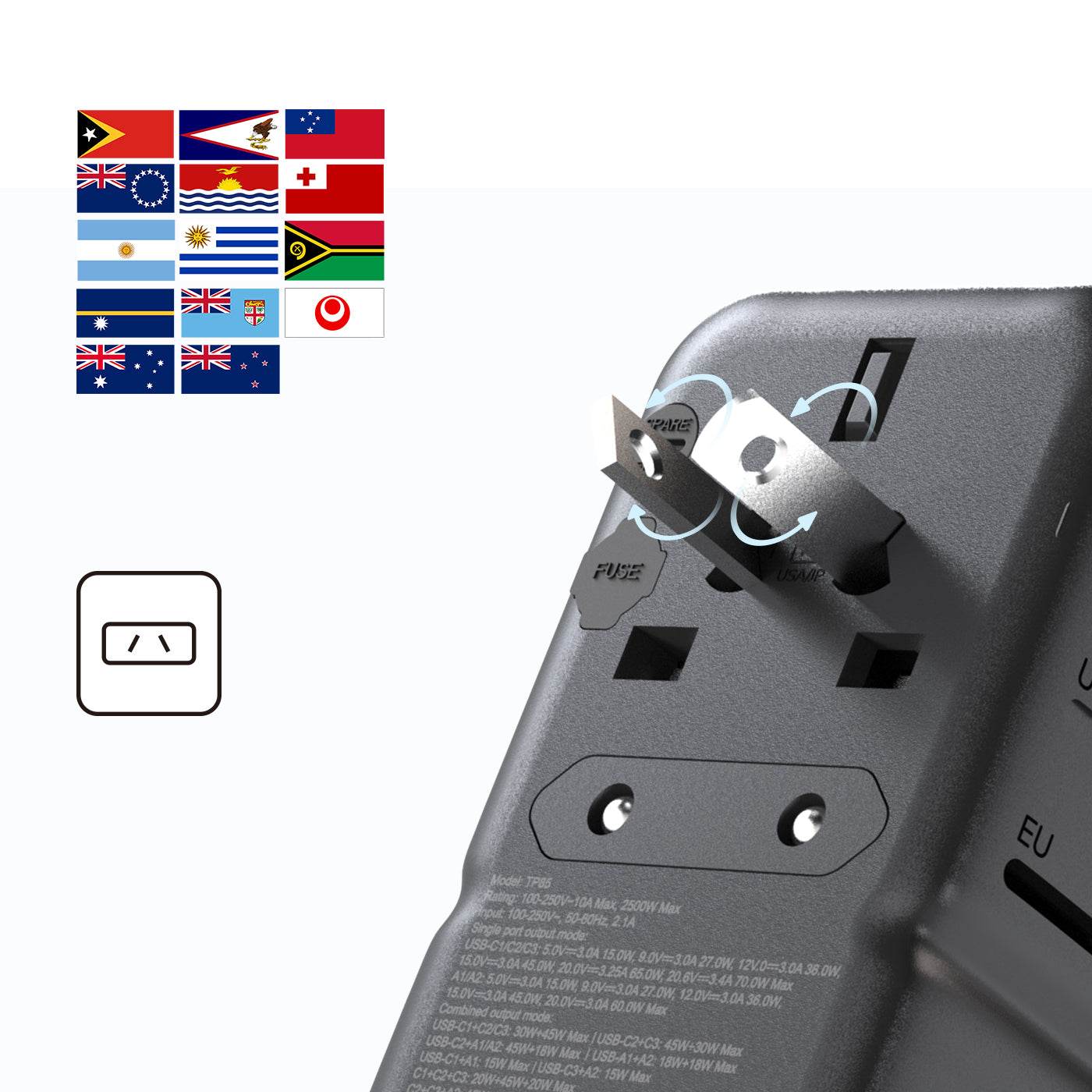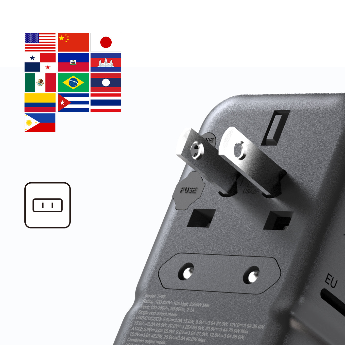 L'adaptateur de voyage universel TP85 prend en charge une prise secteur universelle et cinq ports USB, répondant ainsi à tous vos besoins de charge. Il convertit les prises des États-Unis, de l'UE, du Royaume-Uni et de l'Australie, offrant une compatibilité mondiale inégalée. Compatible avec une entrée de 100 à 250 V, il fonctionne partout dans le monde sans adaptateur supplémentaire, ce qui le rend idéal pour les voyages.