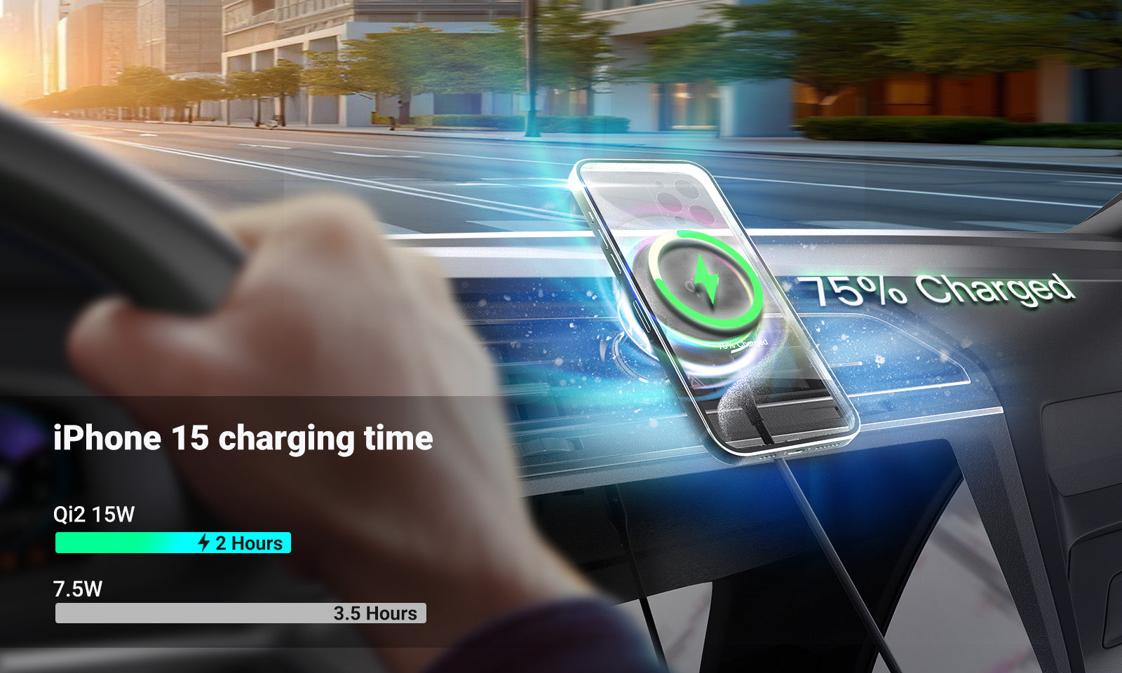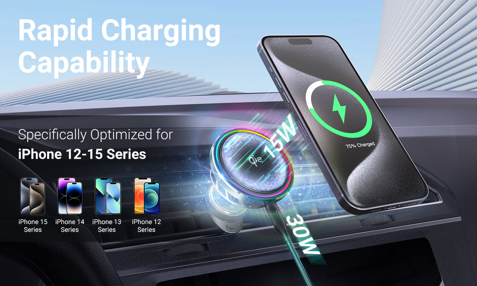 Dotato di tecnologia Qi2 certificata ufficialmente, il caricabatterie wireless per auto MCC01 garantisce una compatibilità impeccabile e una ricarica wireless più sicura per i dispositivi compatibili. MCC01 supporta un ingresso PD da 30 W e un'uscita da 15 W, ottimizzati per iPhone 12-15, per una ricarica più rapida ed efficiente. Basta posizionare il telefono nell'area di ricarica e sei pronto per una ricarica rapida in movimento.
