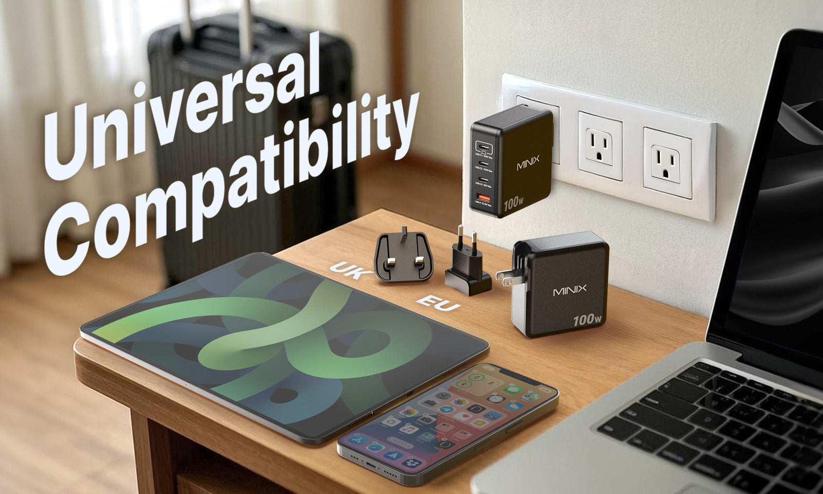 Progettato per supportare un'ampia gamma di dispositivi, MINIX NEO P100 include EU E UK Adattatori per compatibilità con voltaggio universale (100-240 V). Questo lo rende un compagno di viaggio ideale per caricare laptop, tablet, smartphone e altro ancora, ovunque tu vada.