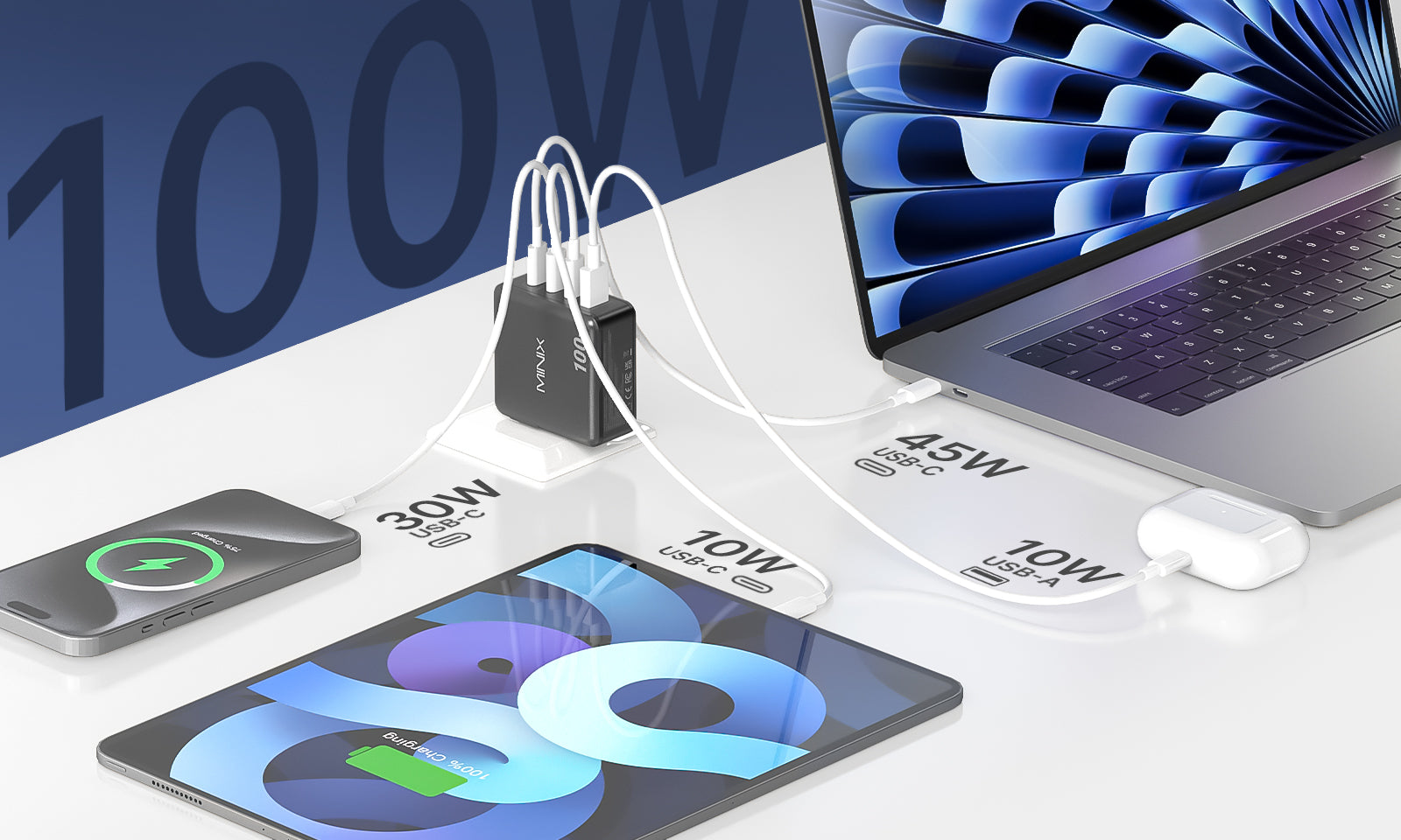 Con una potenza totale di 100 W, MINIX NEO P100 è dotato di tre porte USB-C e una porta USB-A che possono condividere dinamicamente l'alimentazione. Ciò significa che è possibile caricare più dispositivi contemporaneamente senza compromettere la velocità di ricarica.