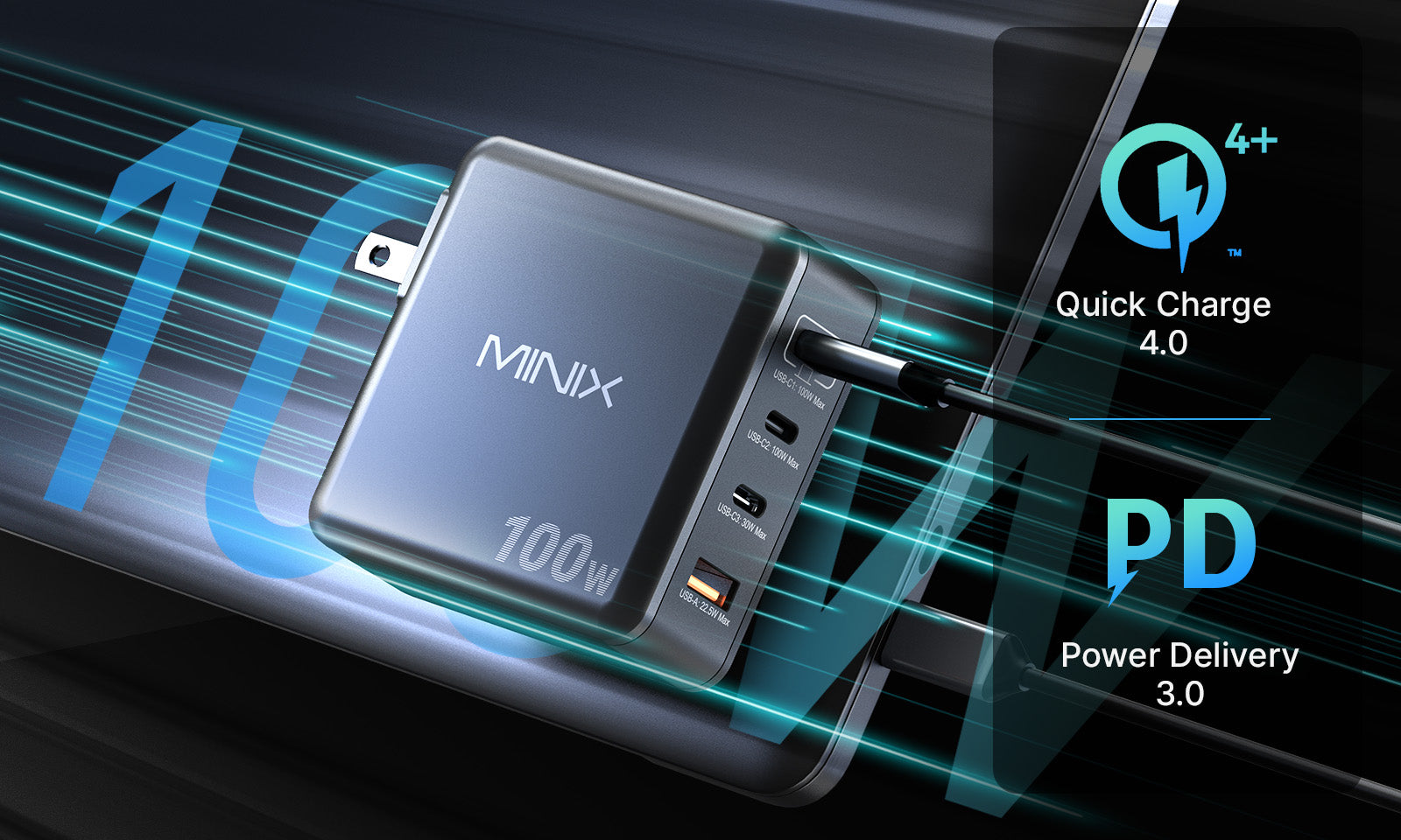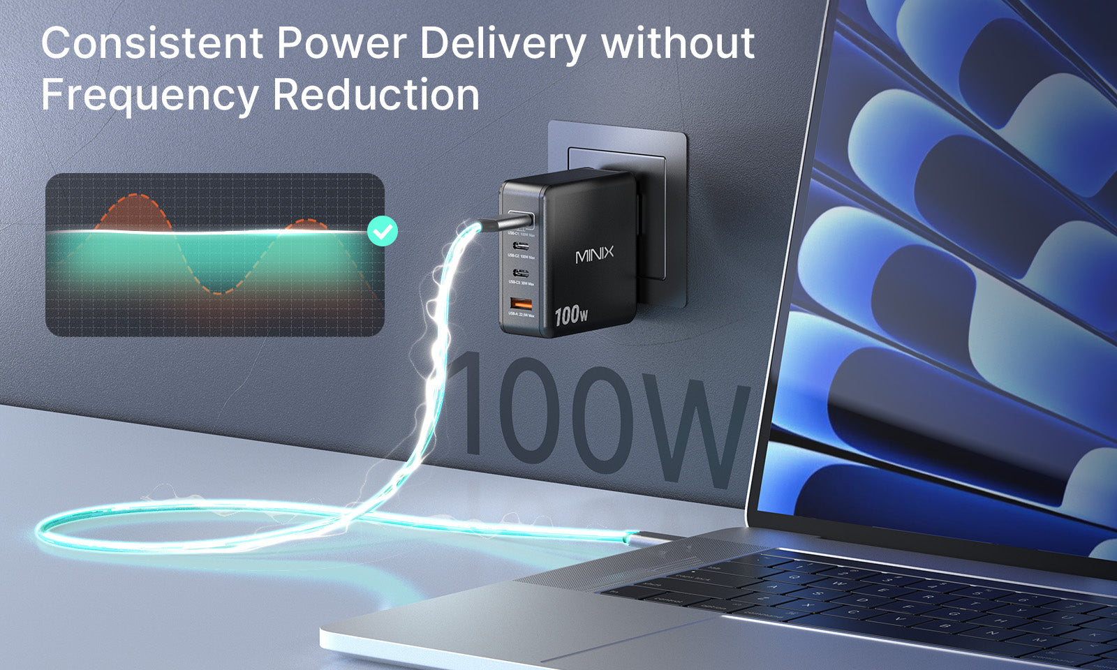 MINIX NEO P100 è progettato per mantenere un'erogazione di potenza stabile e costante durante l'intero processo di ricarica, senza alcuna riduzione della frequenza. Questo garantisce che i tuoi dispositivi ricevano tutta la potenza necessaria, anche quando più dispositivi vengono caricati contemporaneamente. Questa caratteristica garantisce prestazioni ottimali e prolunga la durata dei tuoi dispositivi.