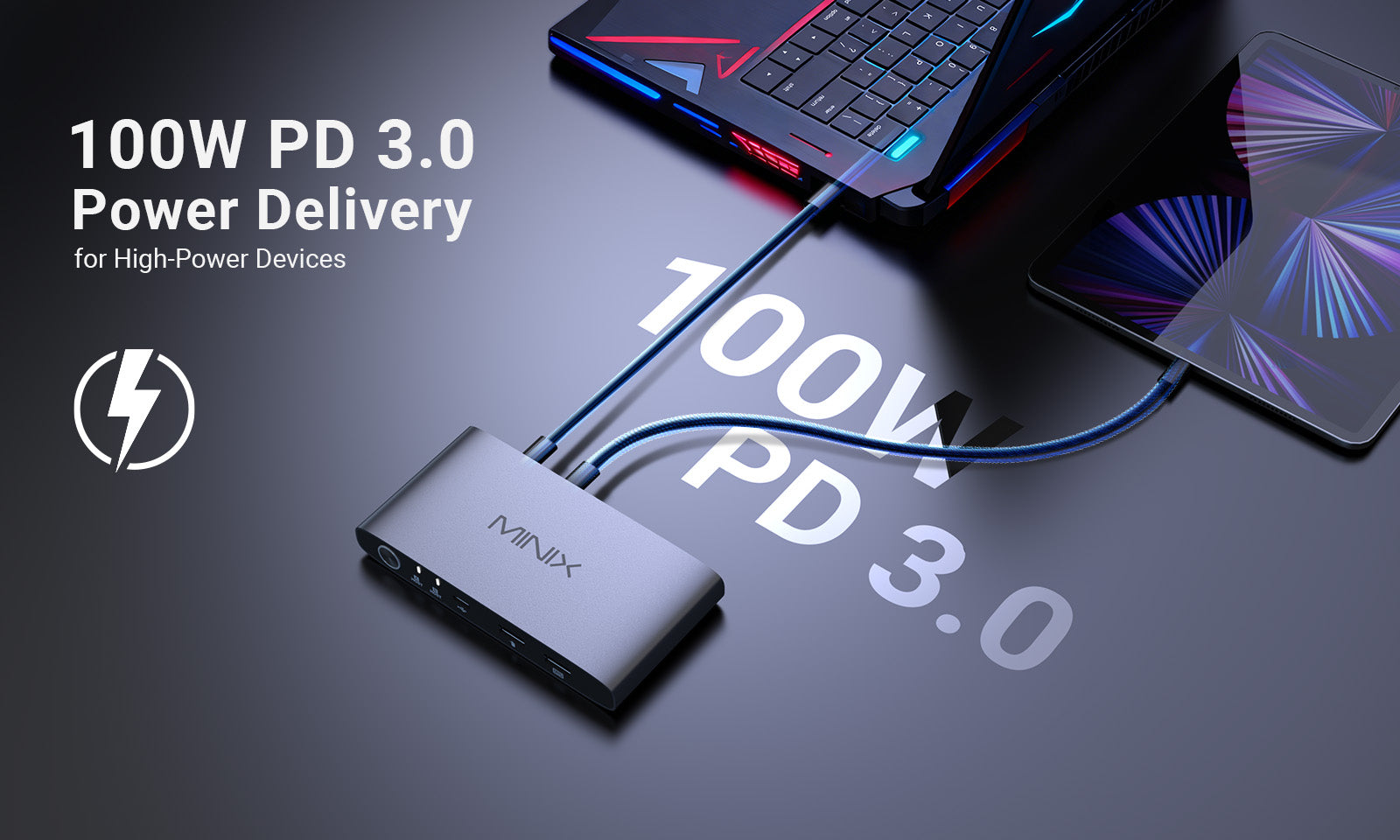 内蔵のUSB-C PD 3.0ポートは最大100Wの電力を供給し、追加の充電器は不要です。ゲーミングノートPC、タブレット、その他の電力消費量の多いデバイスに最適で、パフォーマンスを損なうことなく充電とデータ転送を同時に行えます。