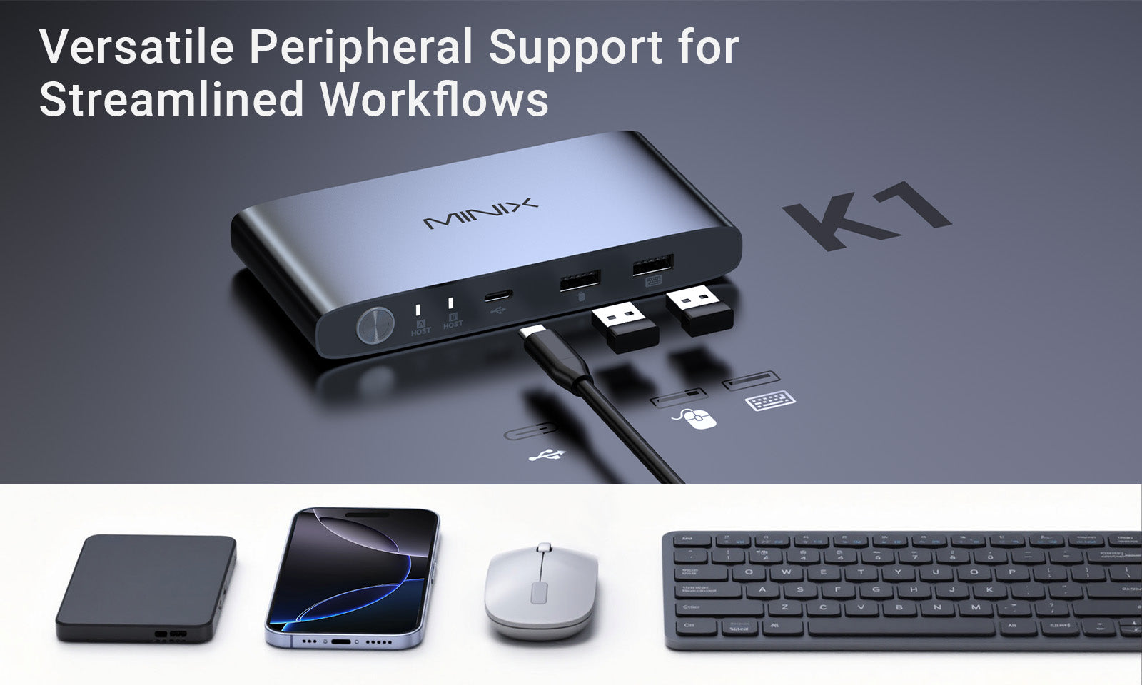 プロフェッショナル、ゲーマー、そしてマルチタスクユーザー向けに設計されたK1 2 in 1 デュアルUSB-C KVMスイッチは、24.2mmの超薄型プロファイルと堅牢な金属製筐体を備えています。コンパクトなフォームファクタはポケット、バッグ、狭いワークスペースにも楽々と収まり、耐久性の高い金属製筐体は放熱性を高め、過酷な環境下でも長期的な信頼性を確保します。