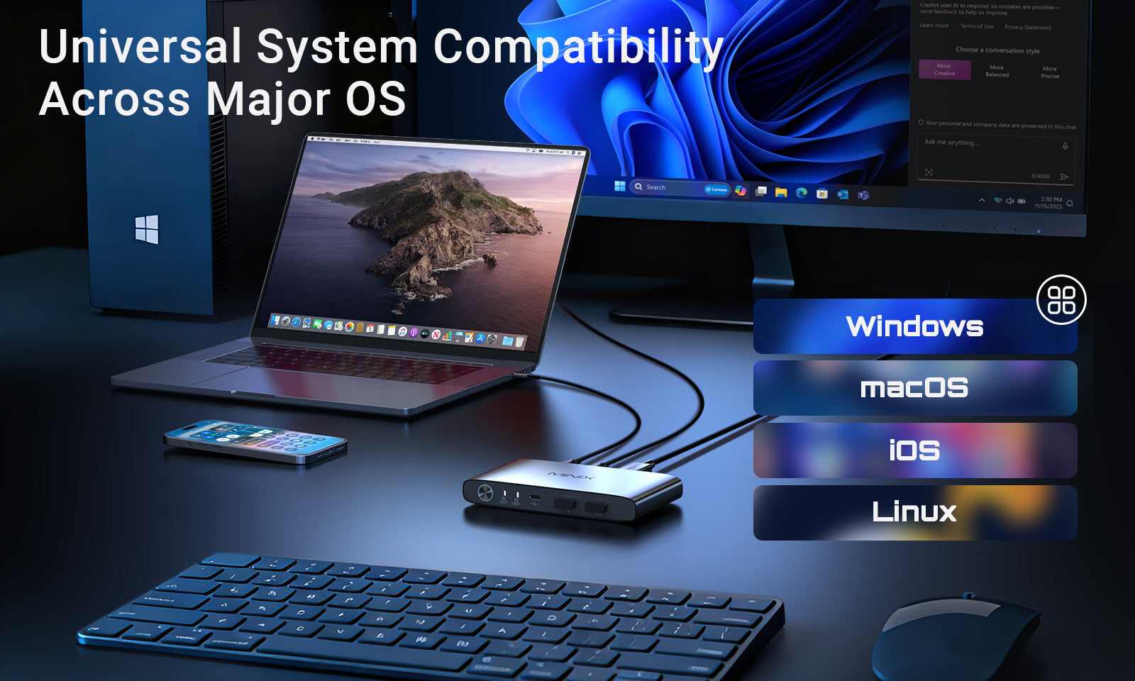 Windows、macOS、iOS、Linux、その他主要なオペレーティングシステムとシームレスに連携します。KVMスイッチは多様なテクノロジーエコシステムにスムーズに適応し、複数のデバイスを使い分けるプロフェッショナルやマルチタスクユーザーにとって、クロスプラットフォームの互換性を確保します。