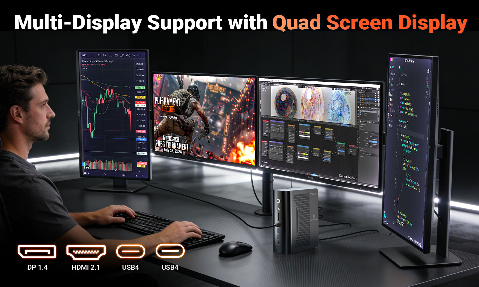 The ER939-AI supports quad screen display via HDMI 2.1, DP 1.4, and USB4 ports, allowing users to connect up to four monitors simultaneously. This feature enhances multitasking capabilities, making it ideal for professionals who need to manage multiple applications or data streams at once.