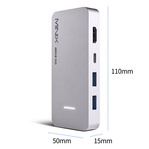 It includes a built-in 480GB SSD [NEO SG4] or 960GB SSD [NEO SG9], Gigabit Ethernet, HDMI (4K @ 60Hz), 2 x USB 3.0 and USB-C [only Power Delivery] in a compact, aluminium hub.