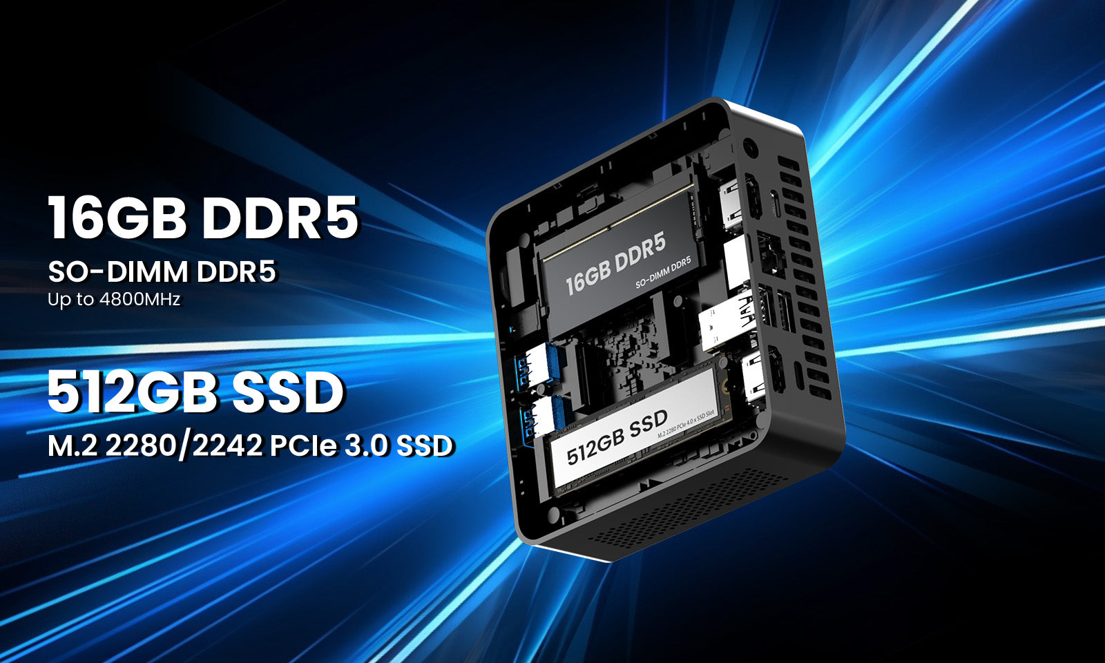 Featuring 16GB of DDR5-4800MHz RAM, the NUC300 enables swift performance and efficient multitasking, even when running multiple resource-heavy apps. It comes standard with a 512GB M.2 2280 PCIe 3.0×4 NVMe SSD, delivering rapid boot times and instant data access. Expandability is a breeze via additional M.2 slots, supporting up to 4TB of extra storage for all your files and applications.