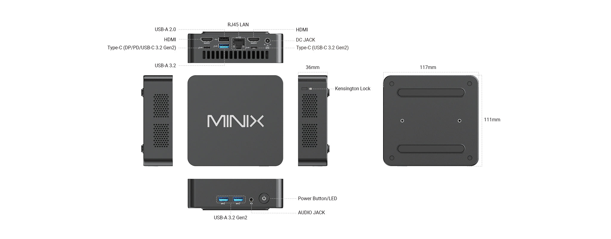Housed in a compact, durable plastic casing, the NUC300 measures just 117×111×36mm (excluding foot pads) — the perfect solution for users seeking a powerful yet space-saving mini PC. Its rugged design is engineered for reliability and long-term use, making it suitable for both home and professional environments.