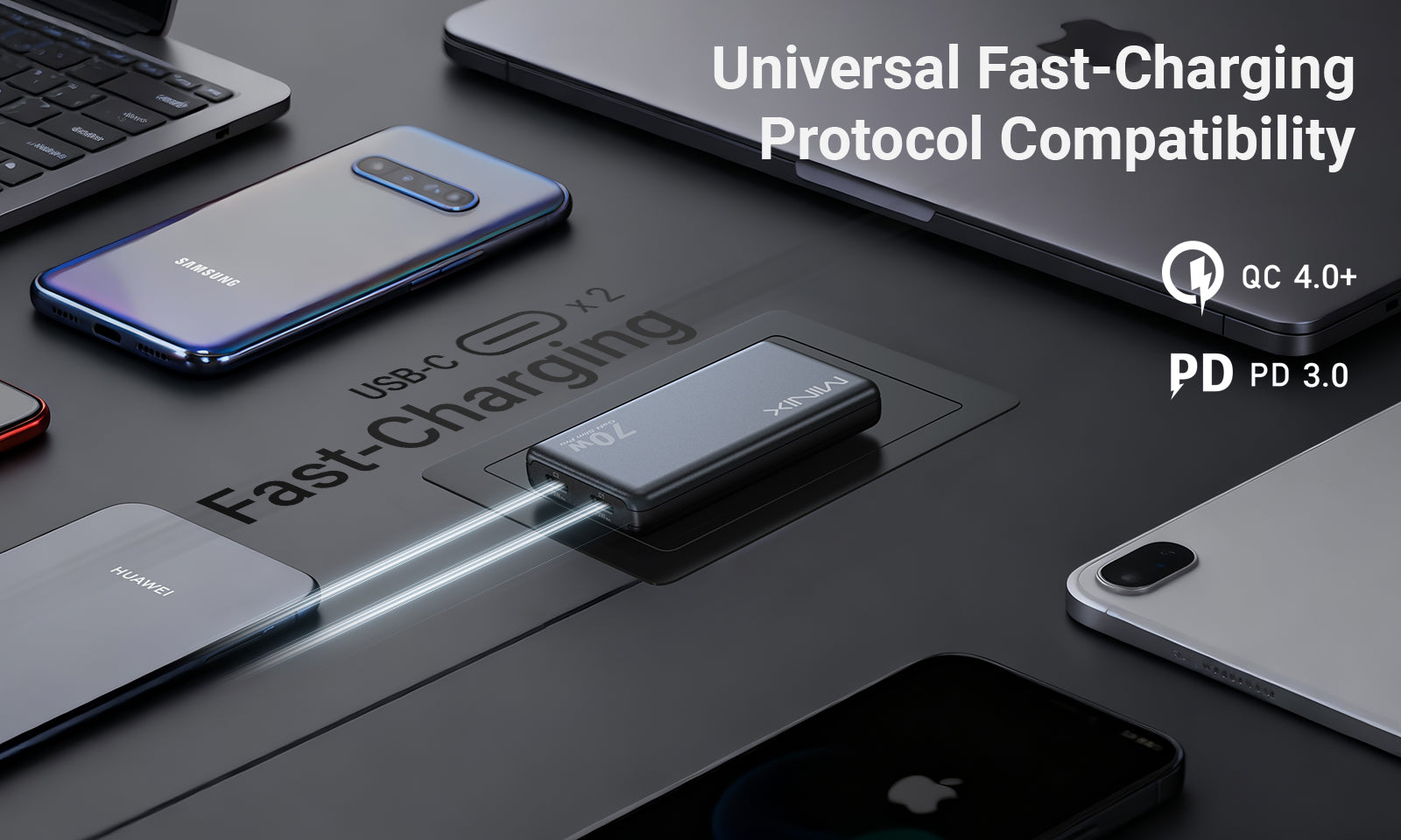 Seamlessly power smartphones, tablets, laptops, and gaming consoles with support for QC2.0/3.0/4.0/4.0+, PD, PPS, UFCS, Samsung AFC, Huawei FCP/SCP, Apple 2.4A, and PE2.0. No more carrying multiple adapters—one charger meets all your needs.