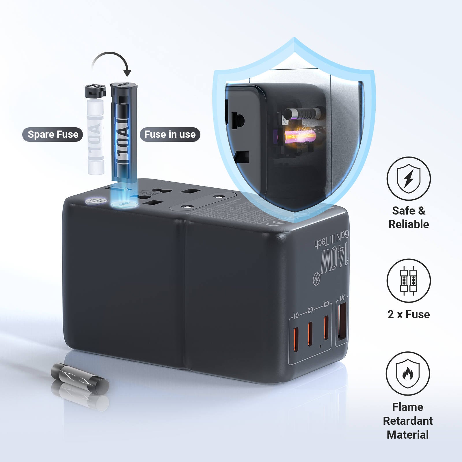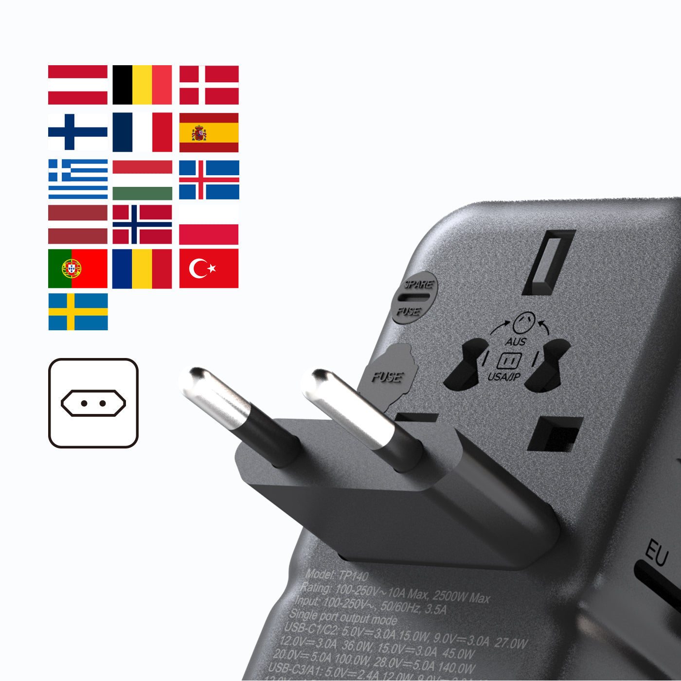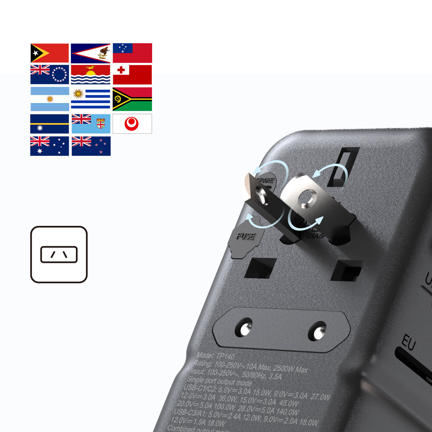 Equipped with a dual 10A fuse system: one active and one spare, the TP140 guards against over-current, over-voltage, and short circuits. It features a safety mechanism that prevents electrical shock. This feature ensures all pins must be fully and correctly inserted before connecting, eliminating the risk of partial and unsafe contacts. Certified by RoHS, CE, and FCC, the TP140 ensures more reliable charging worldwide, keeping your devices safer.