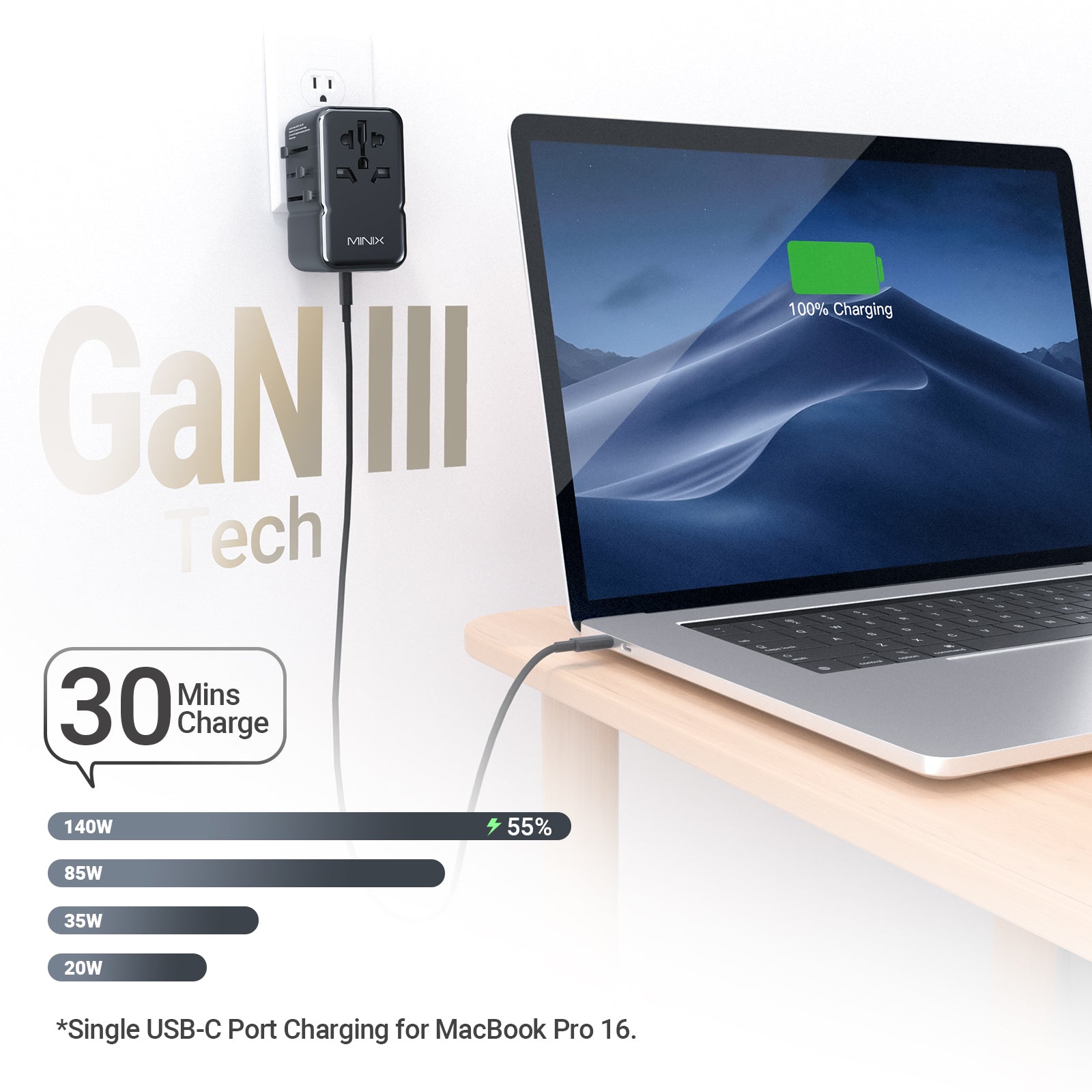 The Minix Universal Travel Adapter leverages advanced GaN III technology for efficient, high-speed charging in a compact design, ensuring maximum portability and performance wherever you go.