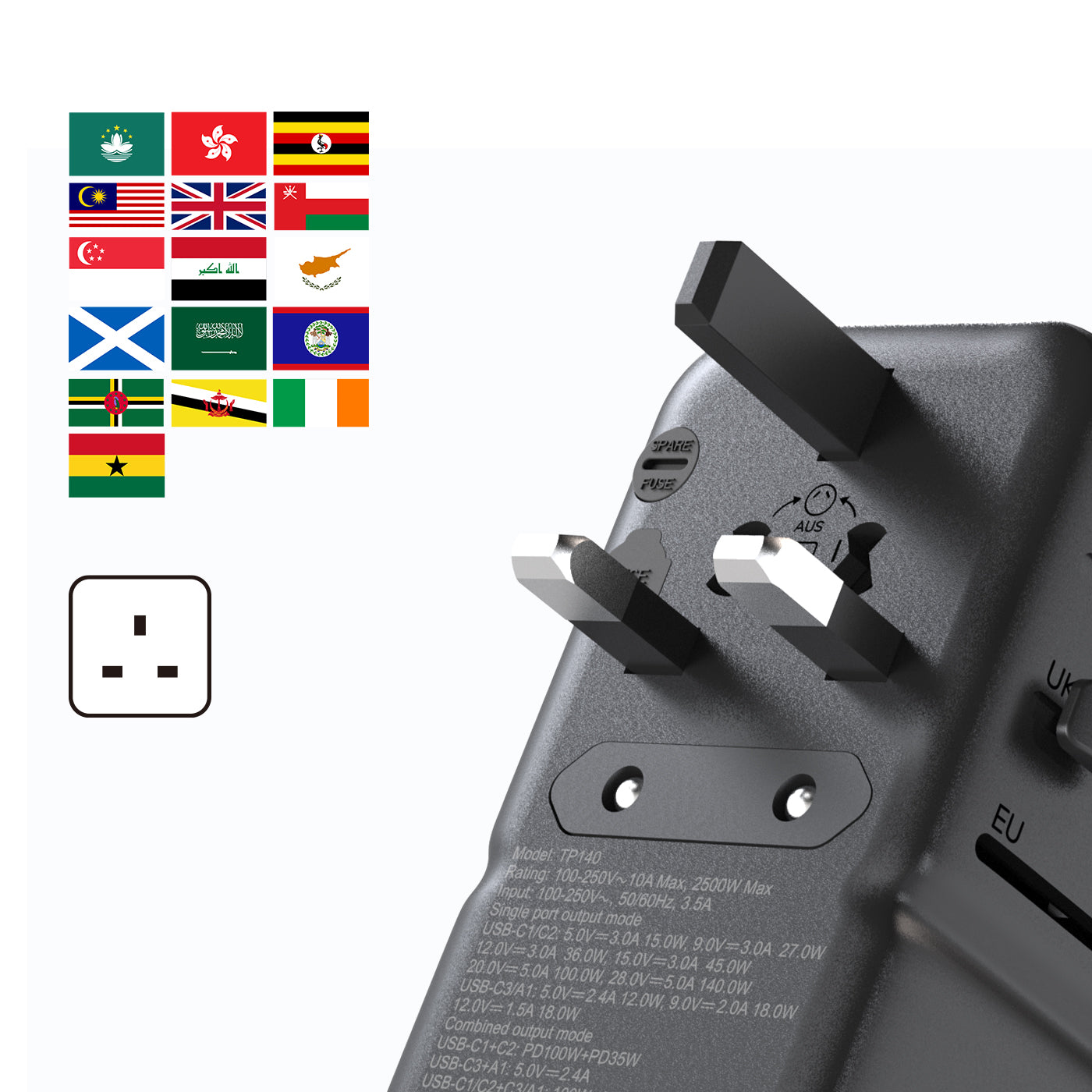 The TP140 universal travel adapter supports one universal AC outlet and five USB ports, meeting all your charging needs. The universal outlet converts plugs from the US, EU, UK, and AU, offering unparalleled worldwide compatibility. Supporting 100-250V input, it works globally without extra adapters, making it perfect for trips.