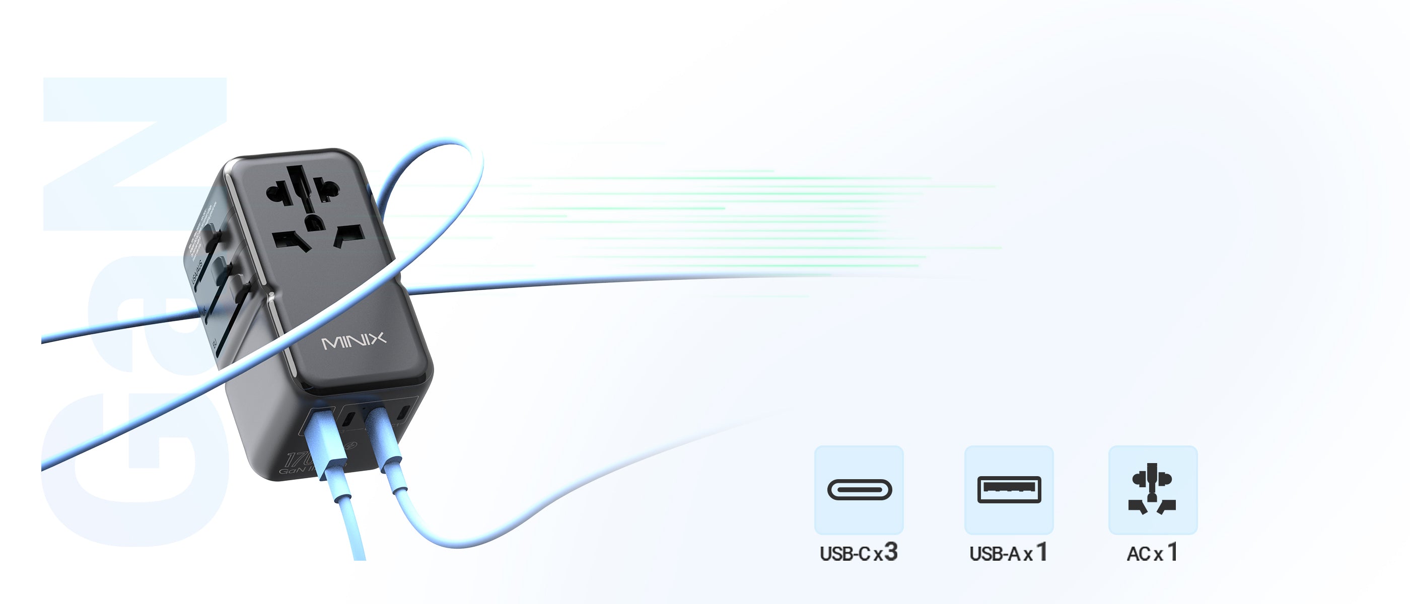 The MINIX TP170 universal travel adapter features cutting-edge GaN III technology, delivering a powerful 170W output for high-speed charging. Equipped with PD 3.1 and Qualcomm Quick Charge 4+, the TP170 delivers ultra-fast charging, optimizes power efficiency, and ensures device safety with advanced thermal management. Whether you're powering up your phone, tablet, or laptop, the TP170 gets you back to full power in no time.
