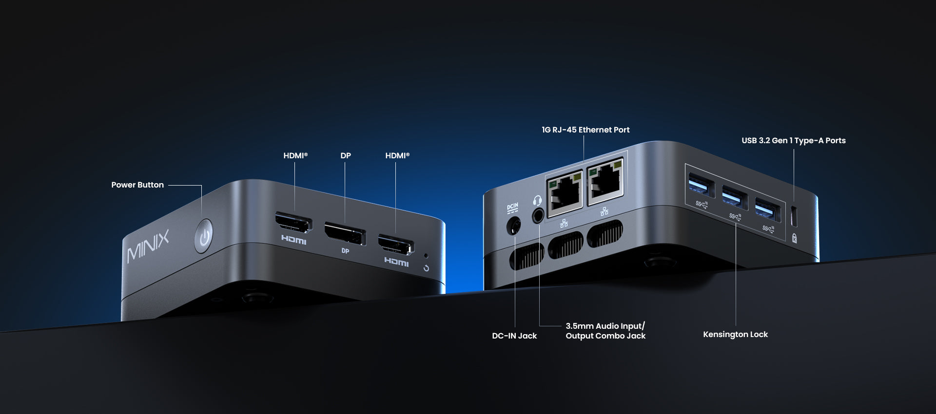 2 x HDMI2.1 TMDS 4K@60Hz; 1 x DP1.4 4K@60Hz; 1 x button; 3 x USB-A 3.2 Gen 1; 1 x Input AC 100~240V; Output 12V 3A 36W Max, DC 2.5/5.5mm; 1 x Audio Output Combo Jack; 2 x RJ-45 1G Ethernet; 1 x Clear CMOS Button (Reset BIOS); 1 x DC-IN Jack (12V⎓3A);