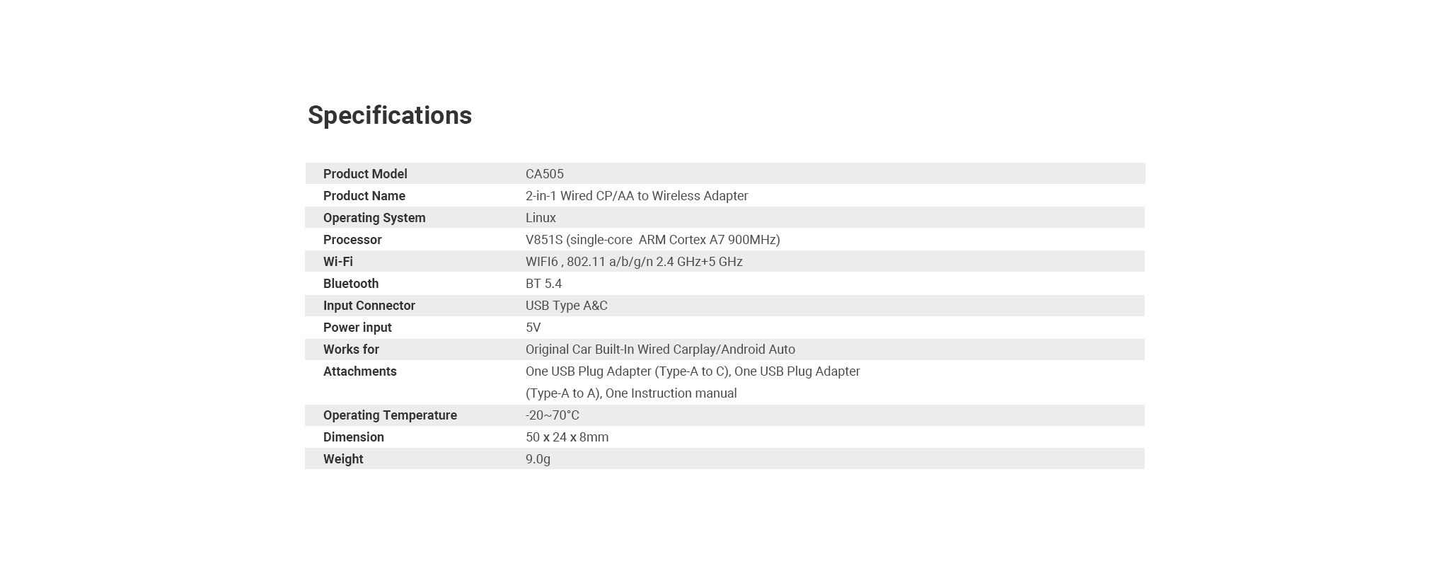 Designed for cars with built-in wired CarPlay/Android Auto, preserving original functionality while upgrading to wireless. Operating temperature: -20~70℃, suitable for extreme climates.