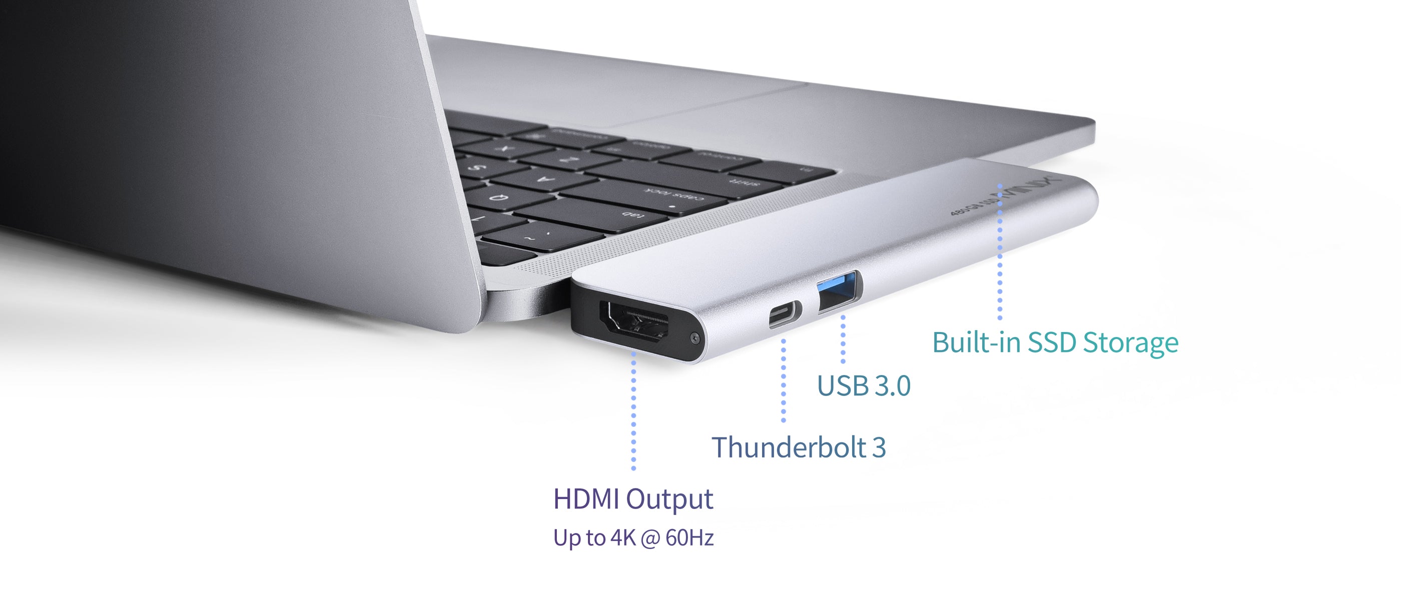 MINIX NEO Storage Pro is an all-in-one solution designed exclusively for MacBook Air and MacBook Pro users, combining SSD storage, HDMI [4K @ 60Hz], Thunderbolt 3, and USB 3.0 ports for high-speed transfers without clutter.