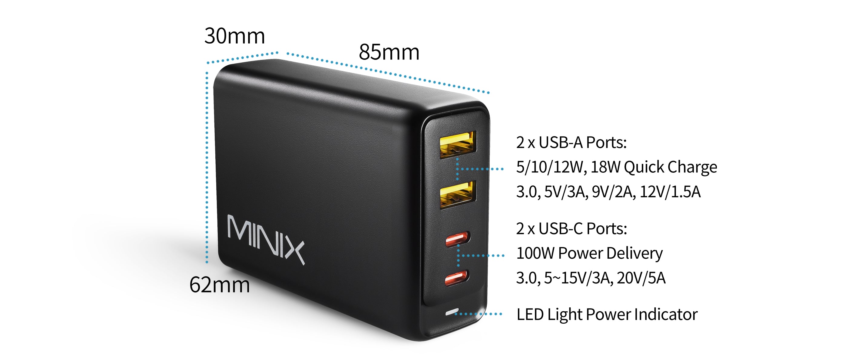 O Carregador GaN Turbo de 100 W com 4 portas da MINIX (MINIX NEO P2) consolida vários carregadores num só, combinando duas portas USB-C e duas portas USB-A num design elegante e compacto. Ideal para o escritório, em casa ou em viagem.