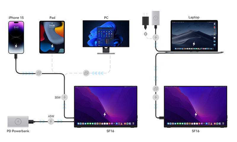 A funcionalidade Passthrough permite que um powerbank PD forneça energia ao monitor, enquanto o monitor, ligado via USB-C, carrega o portátil, garantindo um loop suave e eficiente para o carregamento simultâneo do dispositivo.
