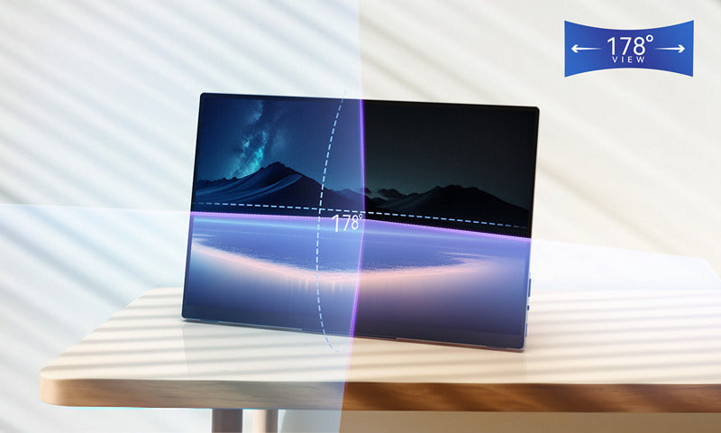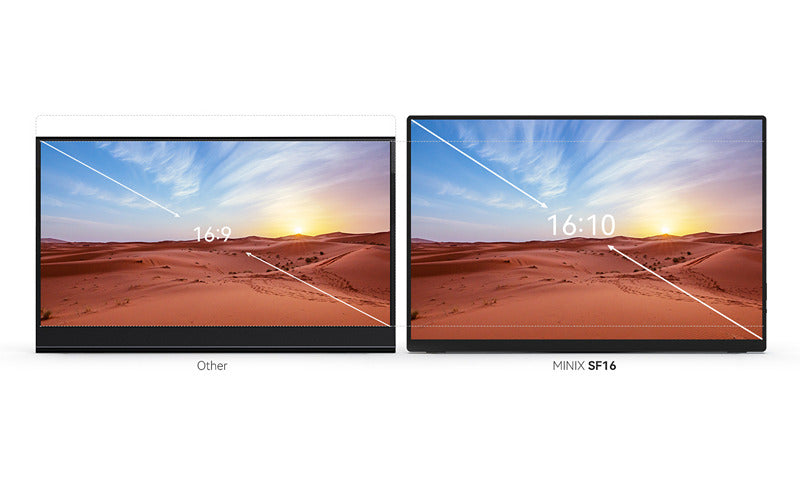 MINIX SF16/SF16T, um monitor touchscreen HD de 16" que eleva a experiência visual com o seu impressionante espectro de cores 100% sRGB. Este ecrã imersivo oferece tons realistas e uma precisão de cor precisa, perfeita para design, jogos e criação de conteúdos.